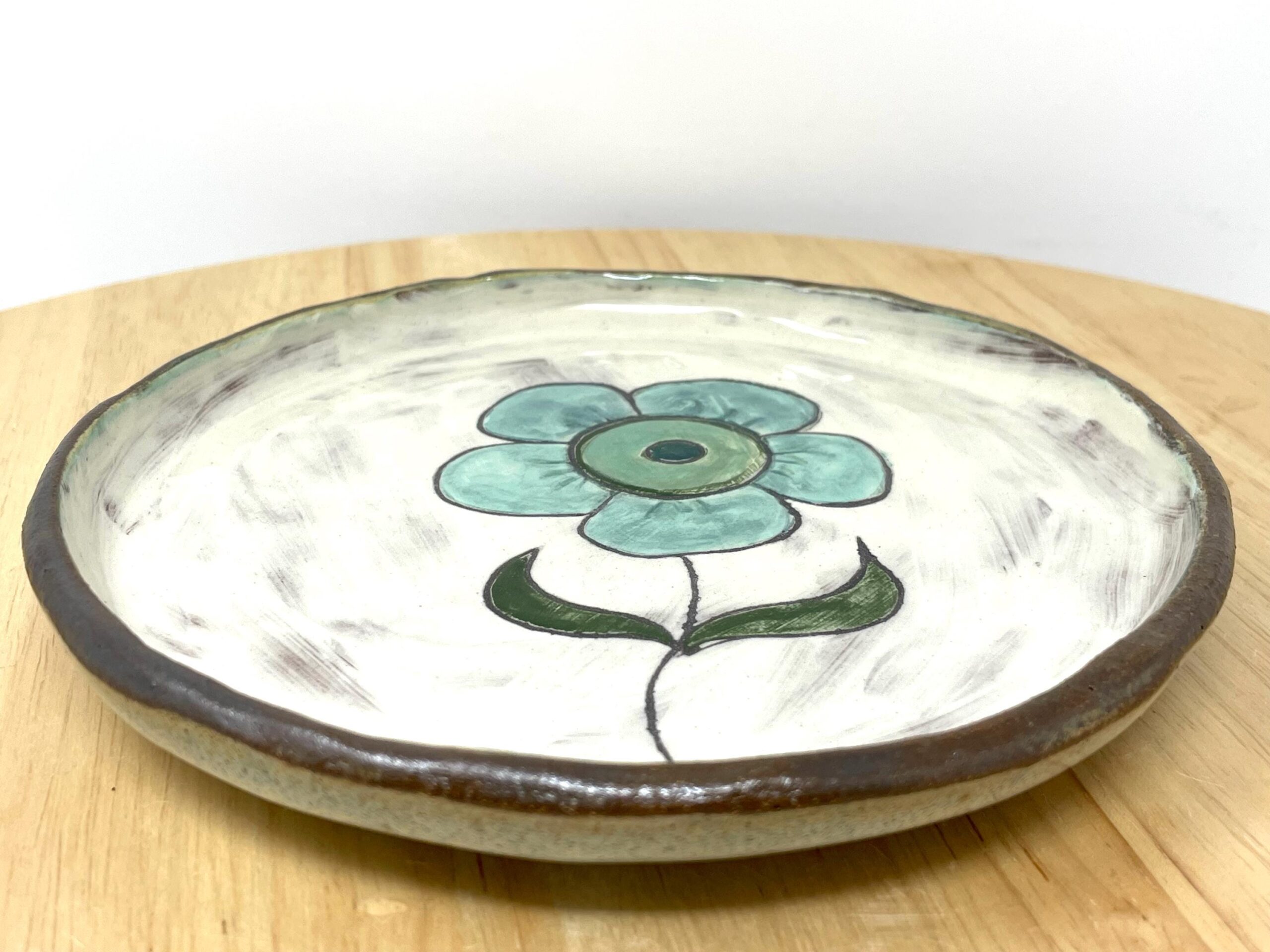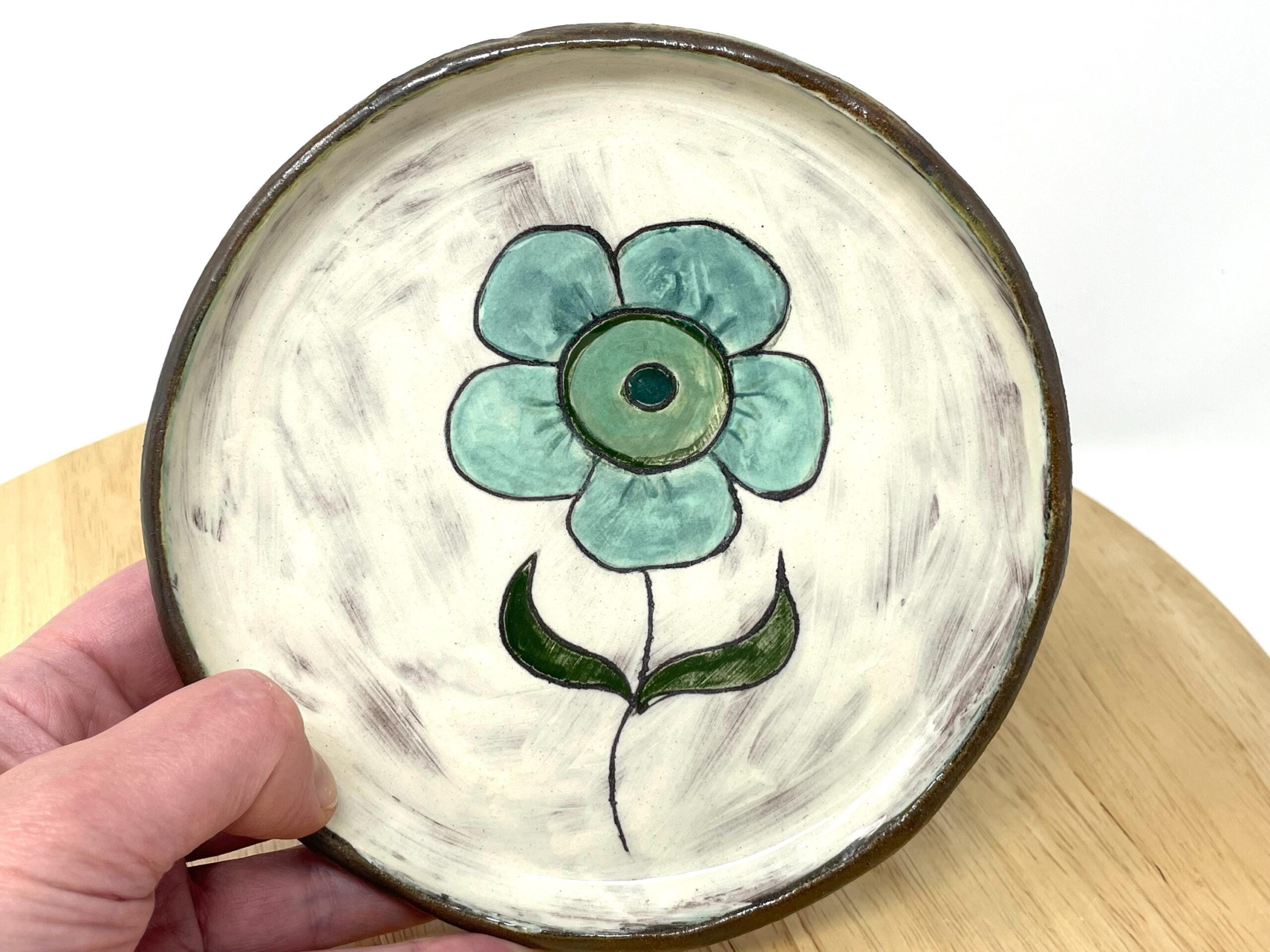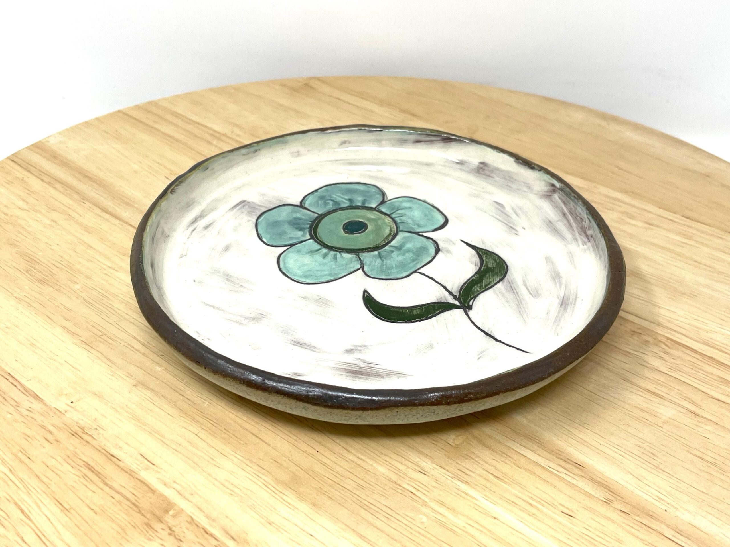 The plate features a smooth ivory interior created with white slip under transparent glaze, providing the perfect canvas for its standout design—a delicate seafoam green flower with five soft petals and a circular center in deeper green tones, complemented by a pair of deep forest green leaves along a simple stem. Each element is meticulously scratched by hand into the surface, creating a folk-art inspired aesthetic. The rich graphite-colored rim frames the piece beautifully, while the fully glazed bottom ensures both beauty and functionality.