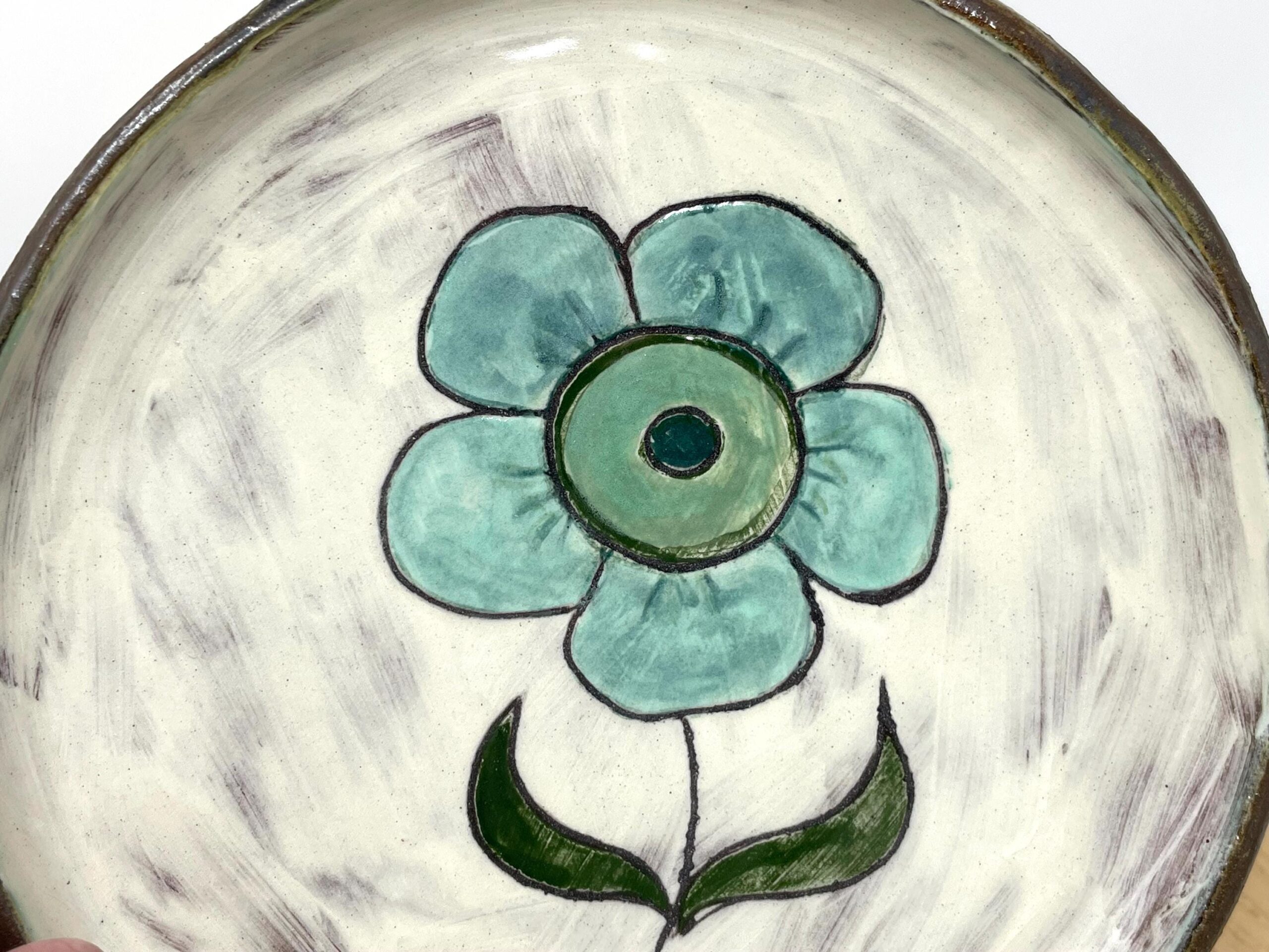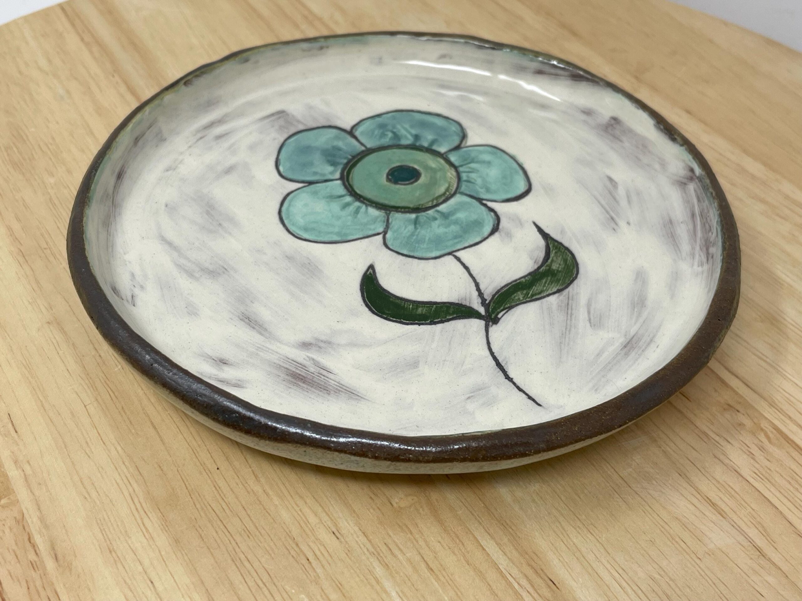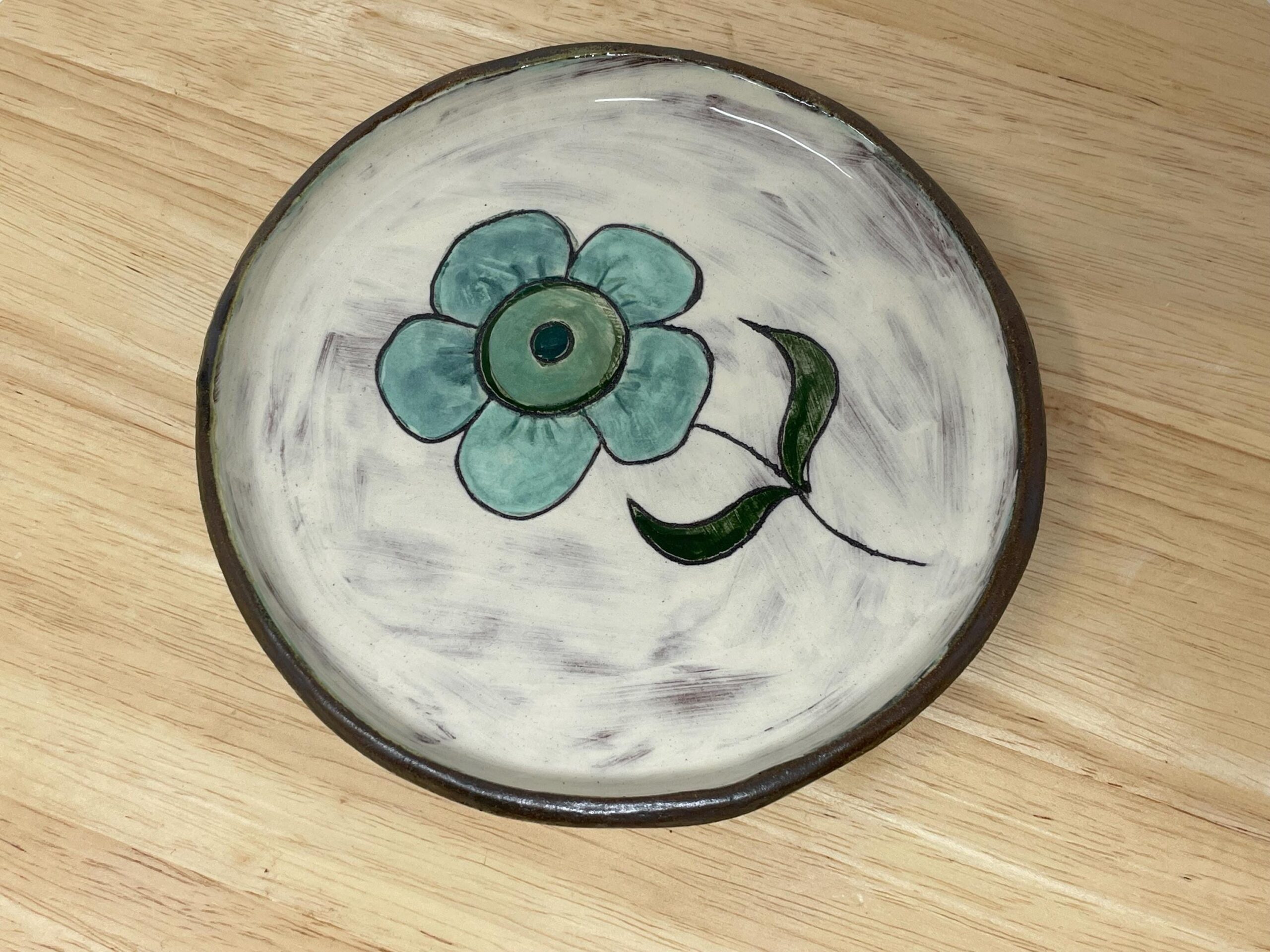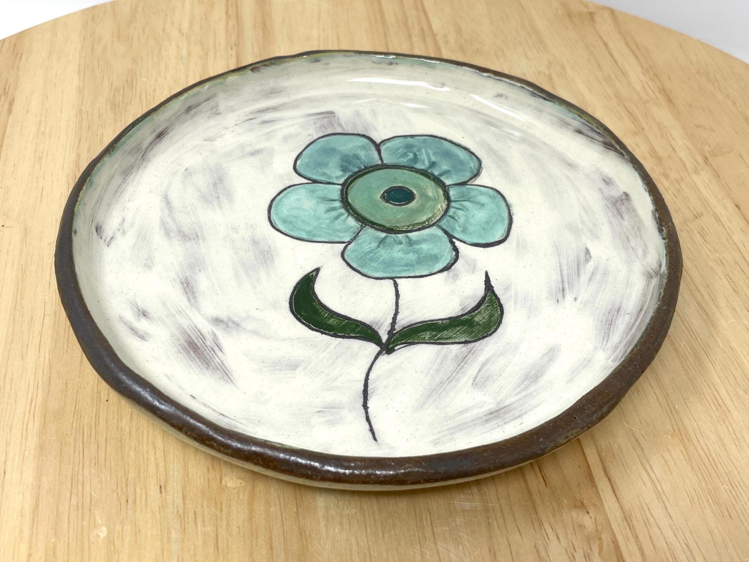 The plate features a smooth ivory interior created with white slip under transparent glaze, providing the perfect canvas for its standout design—a delicate seafoam green flower with five soft petals and a circular center in deeper green tones, complemented by a pair of deep forest green leaves along a simple stem. Each element is meticulously scratched by hand into the surface, creating a folk-art inspired aesthetic. The rich graphite-colored rim frames the piece beautifully, while the fully glazed bottom ensures both beauty and functionality.