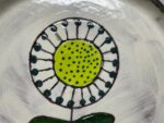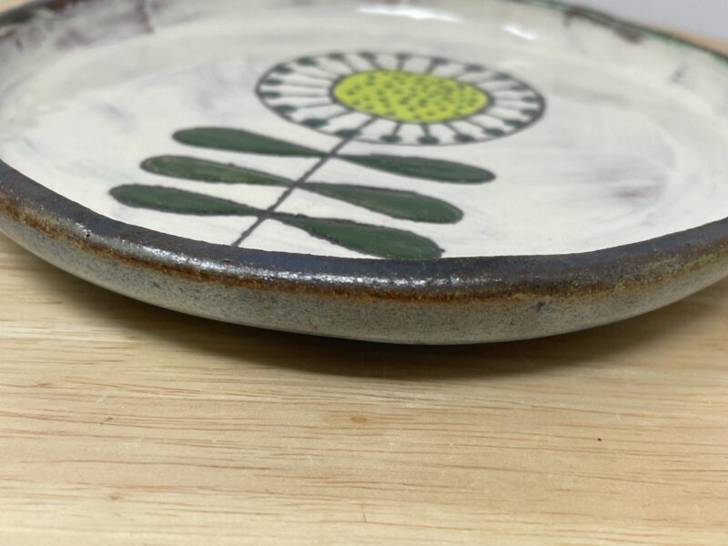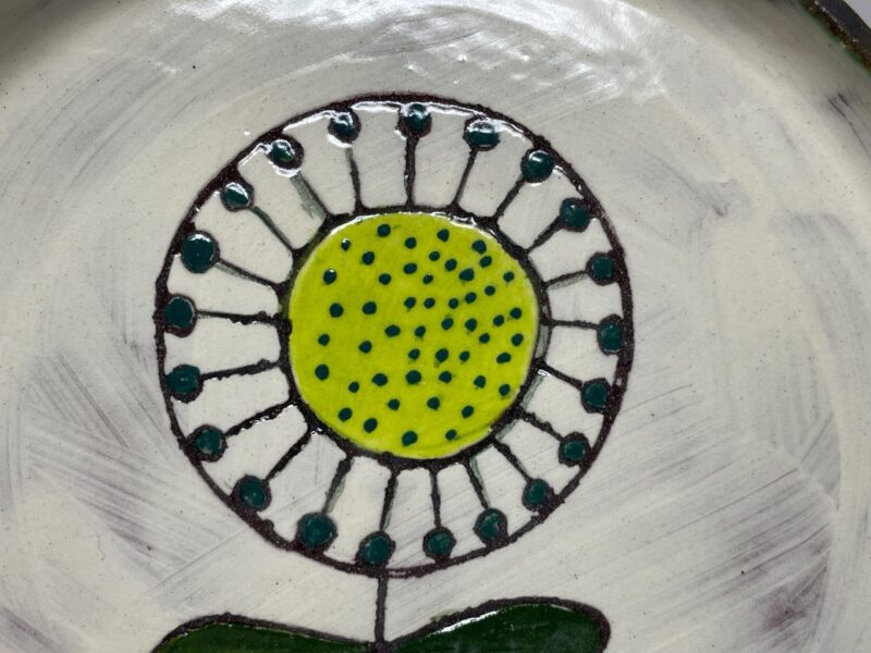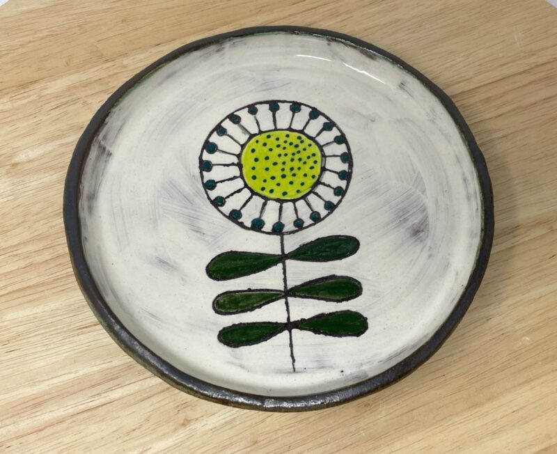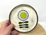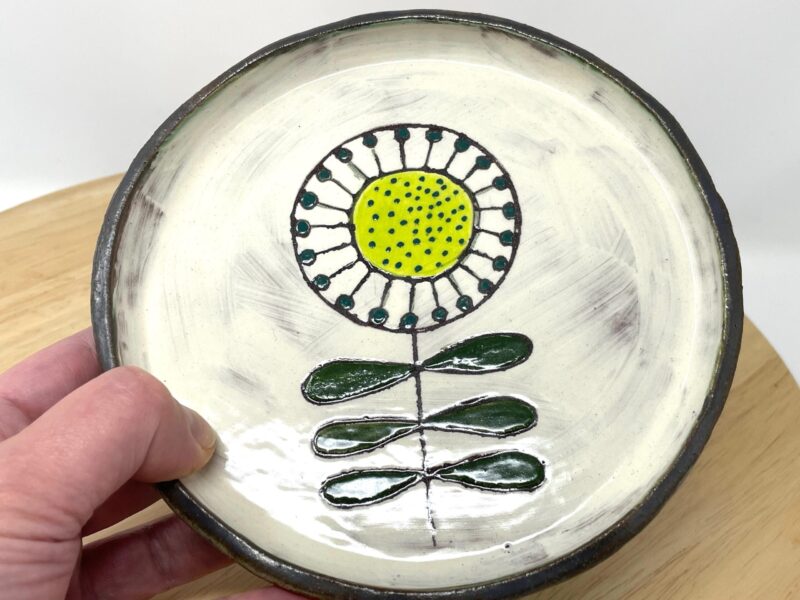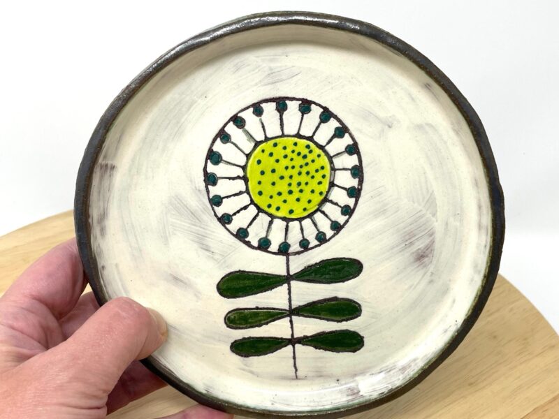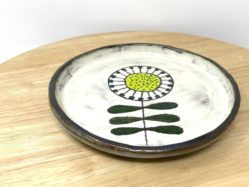 The plate features a smooth ivory interior created with white slip under transparent glaze, providing the perfect canvas for its standout design—a cheerful sunflower-inspired bloom with a vibrant lime green dotted center surrounded by delicate radiating lines tipped with teal-green dots. The botanical motif is completed with three pairs of deep forest green leaves along a central stem, all meticulously scratched by hand into the surface. The rich graphite-colored rim frames the piece beautifully, while the fully glazed bottom ensures both beauty and functionality.