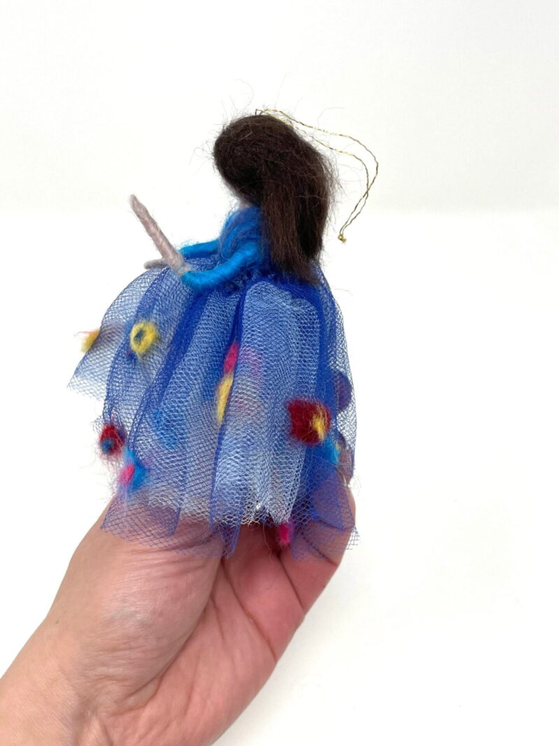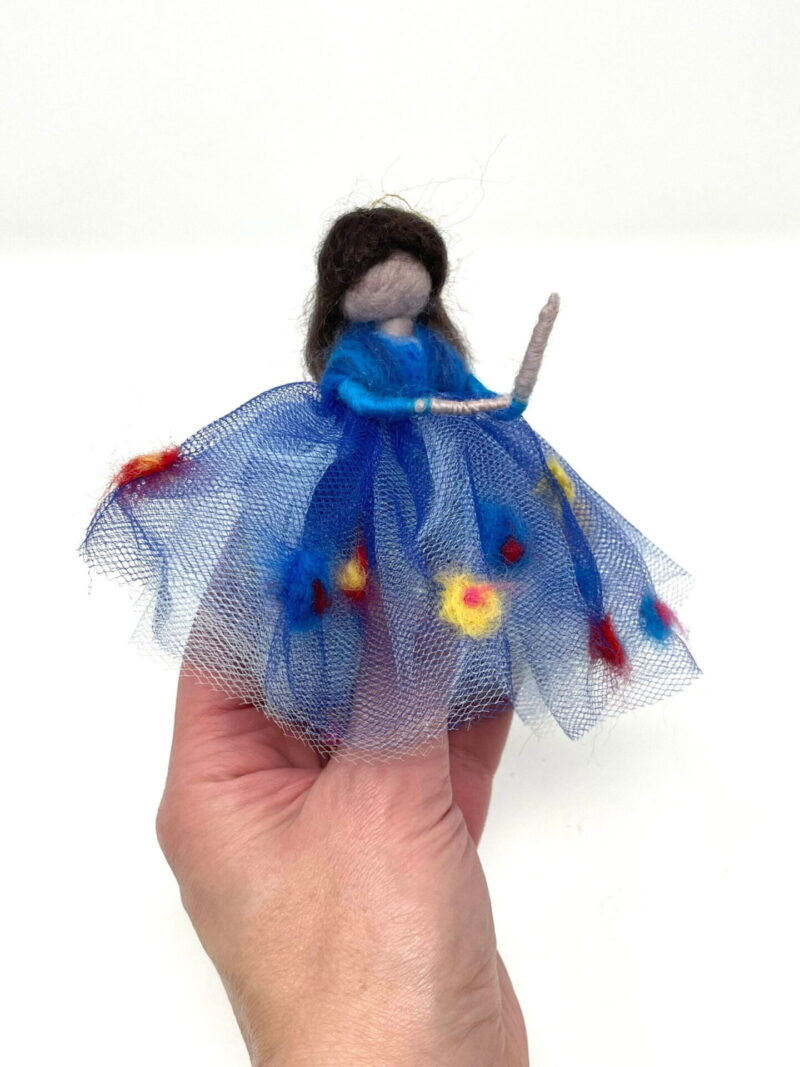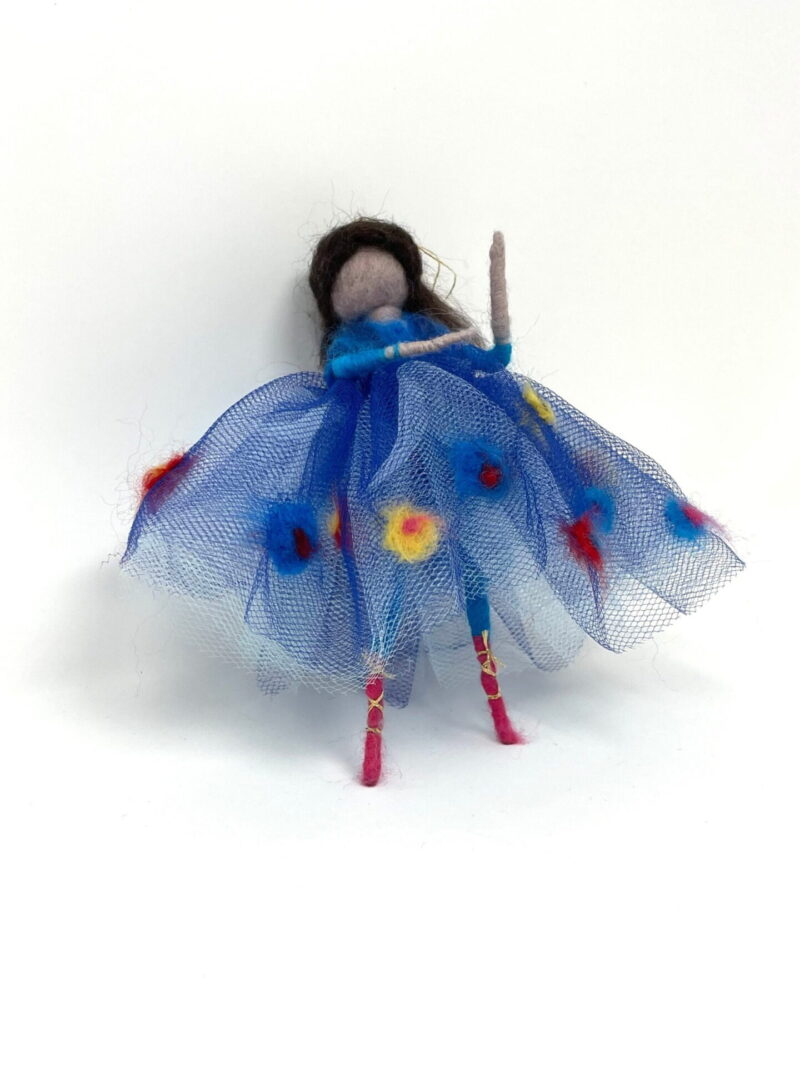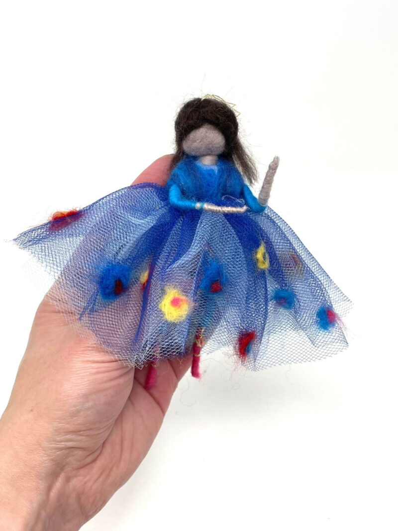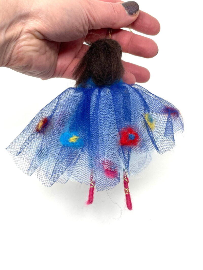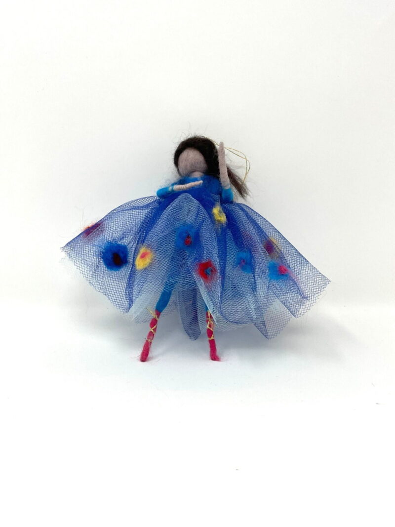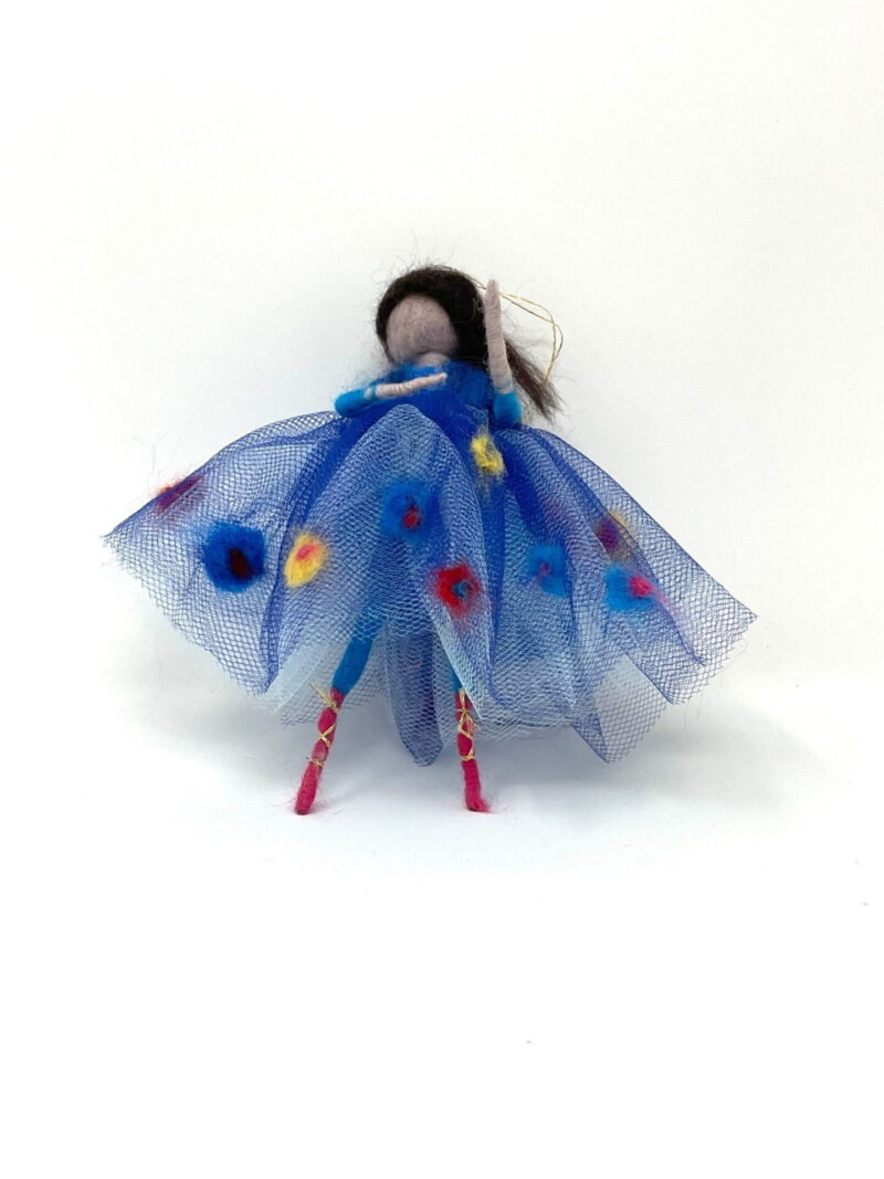 This listing is for a handmade wool felted ballerina, in royal blue skirt decorated with colourful wool flowers. She was made by my mum using wool felting technique. It has a wire skeleton, so she can be made to sit as well.