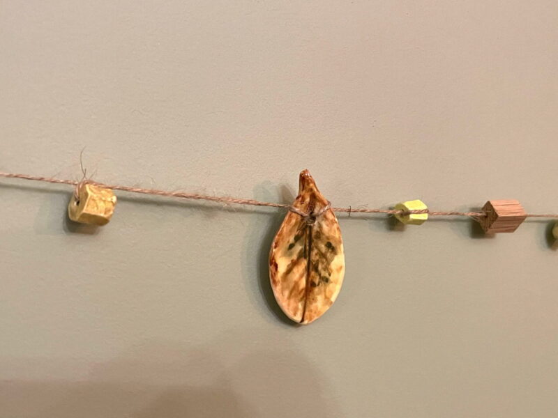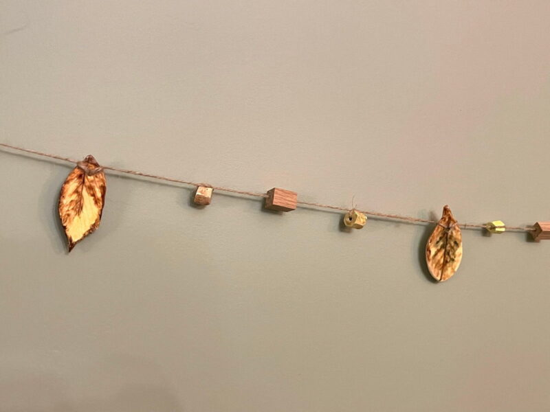 To enhance the composition further, we've added clay beads alongside oak beads made by my talented husband. Every component is thoughtfully strung together on a durable hemp yarn.