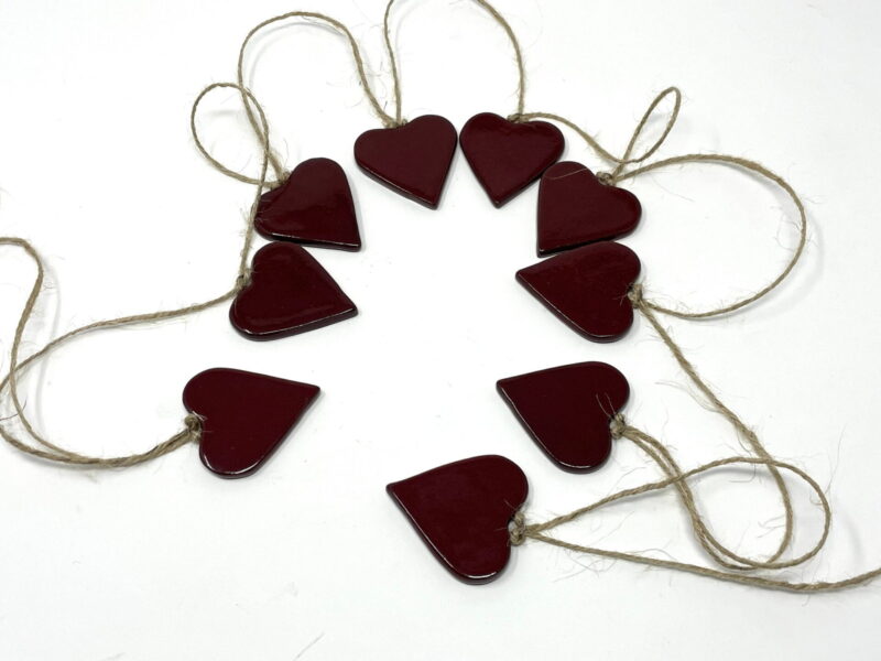 Introducing the Deep Red Firebrick Ceramic Heart Garland, an exquisite handmade decoration that will add a touch of rustic charm to any space. Crafted from grey clay, this garland features nine heart-shaped ornaments, each adorned with a metal hanger for easy hanging. The pieces are then fired and glazed with a stunning glossy deep red finish, creating a captivating contrast against the grey clay.