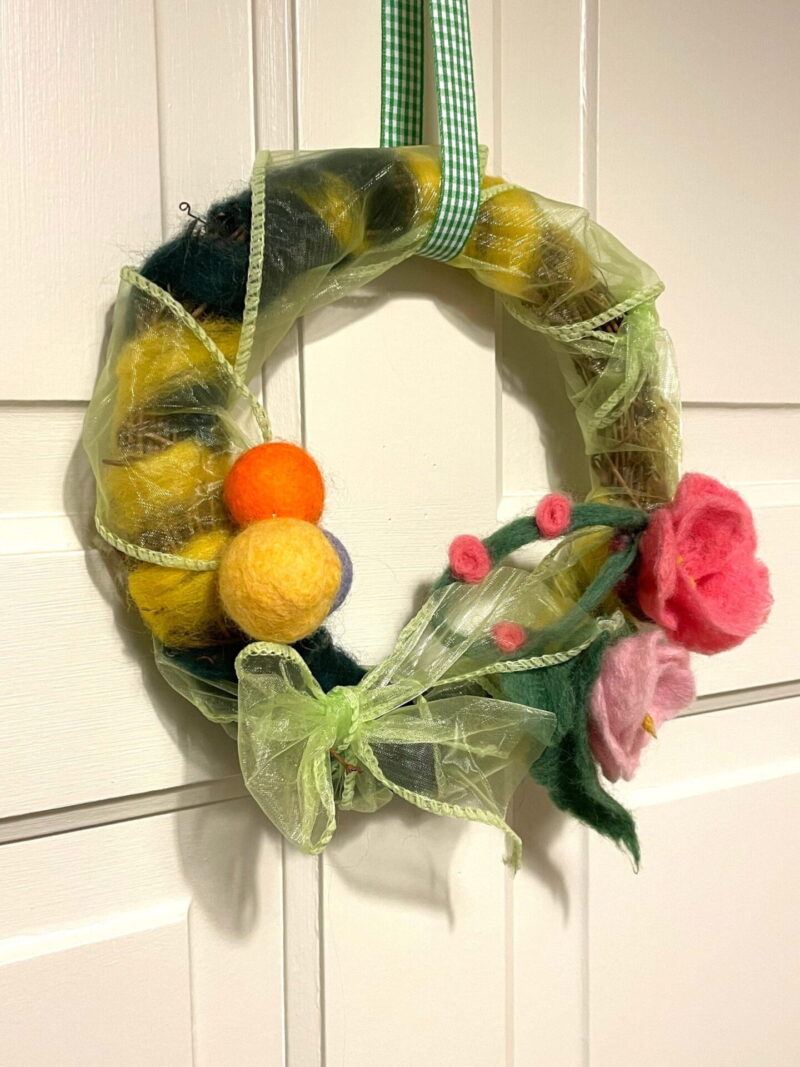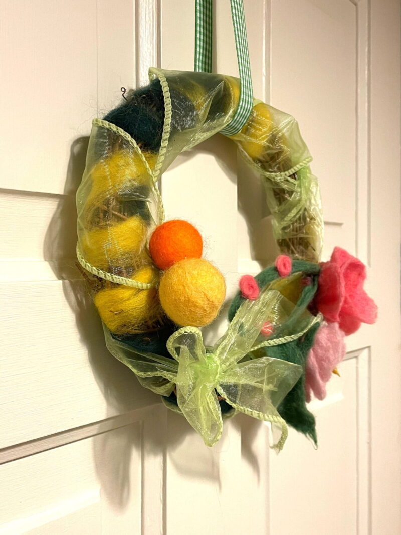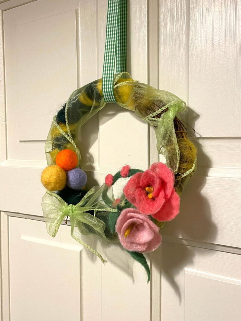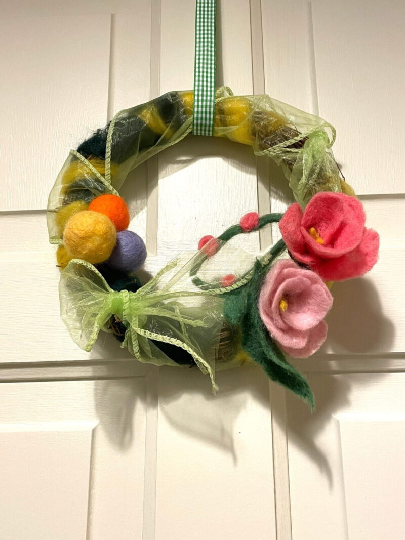Easter Wreath with wool felted flowers and colourful balls decoration /Handmade hanging decor