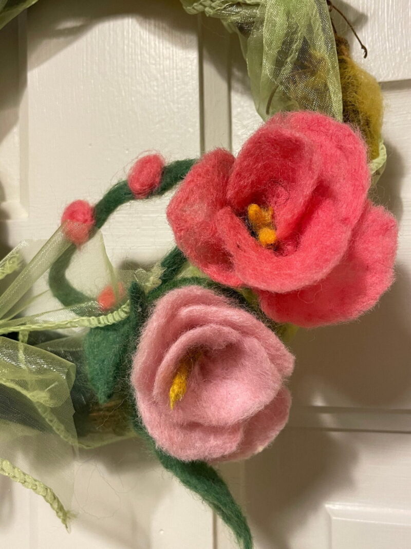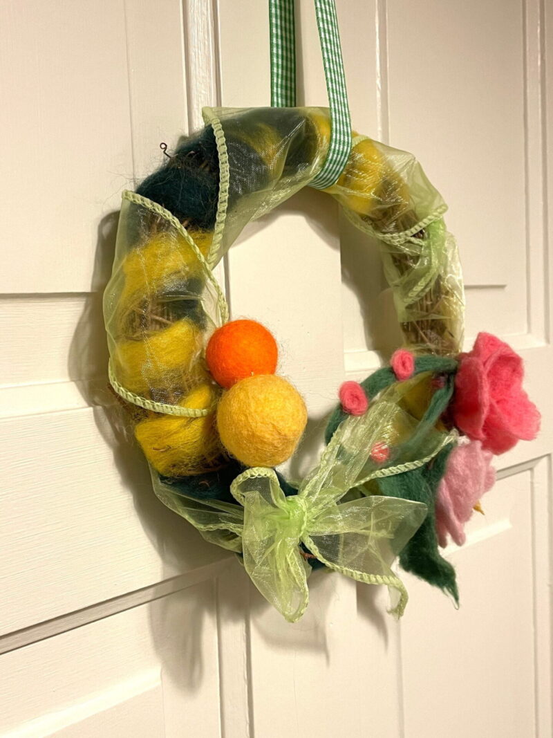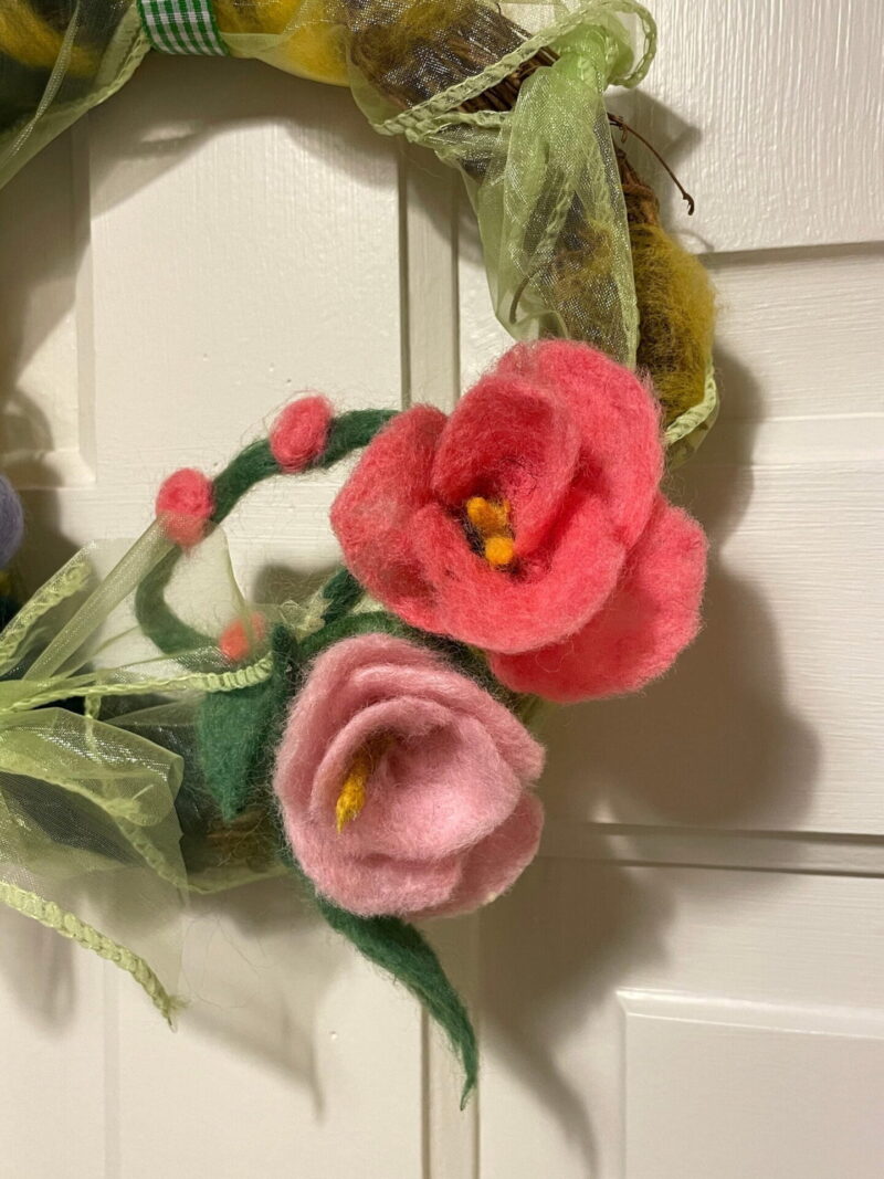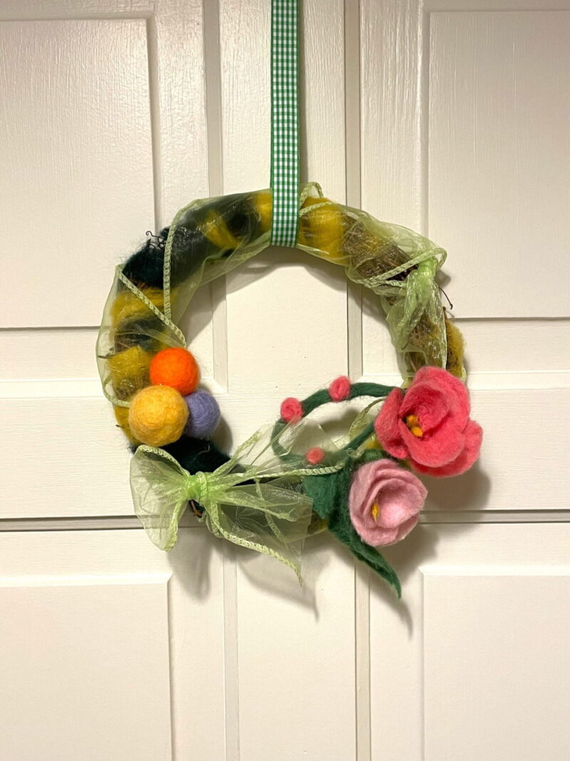 Easter Wreath with wool felted flowers and colourful balls decoration /Handmade hanging decor