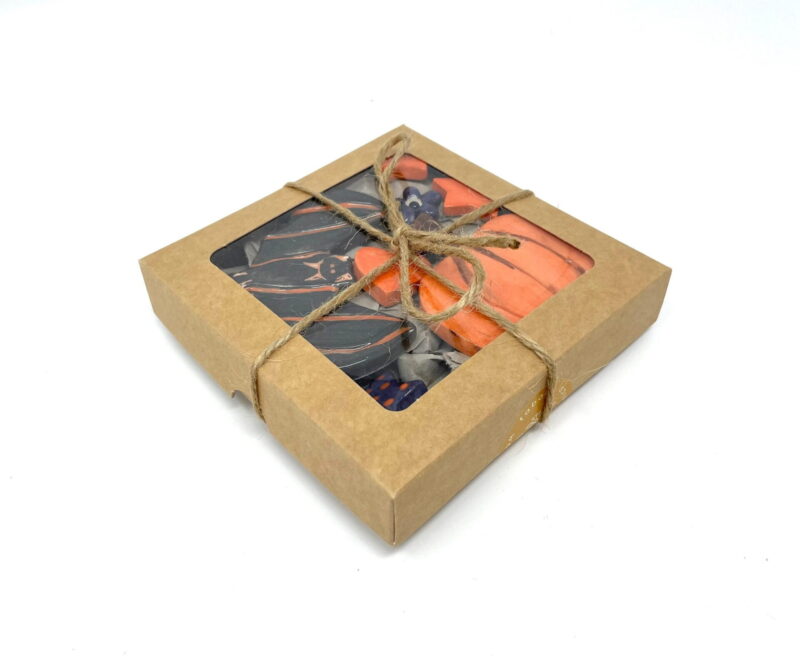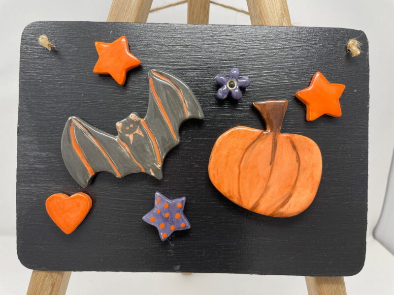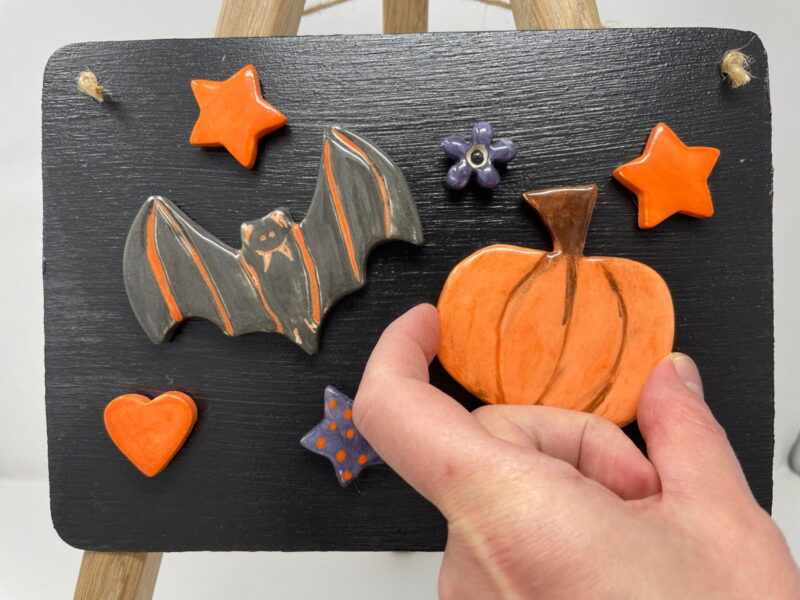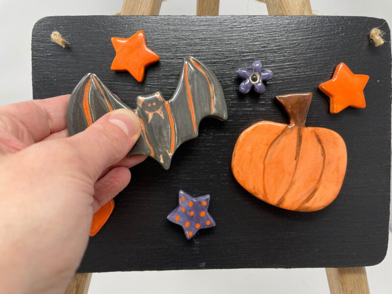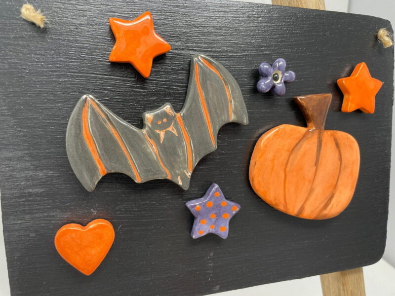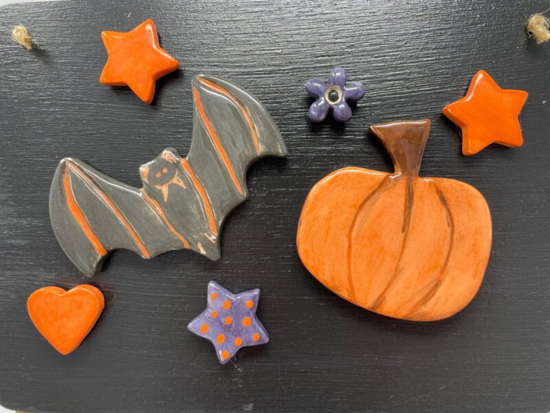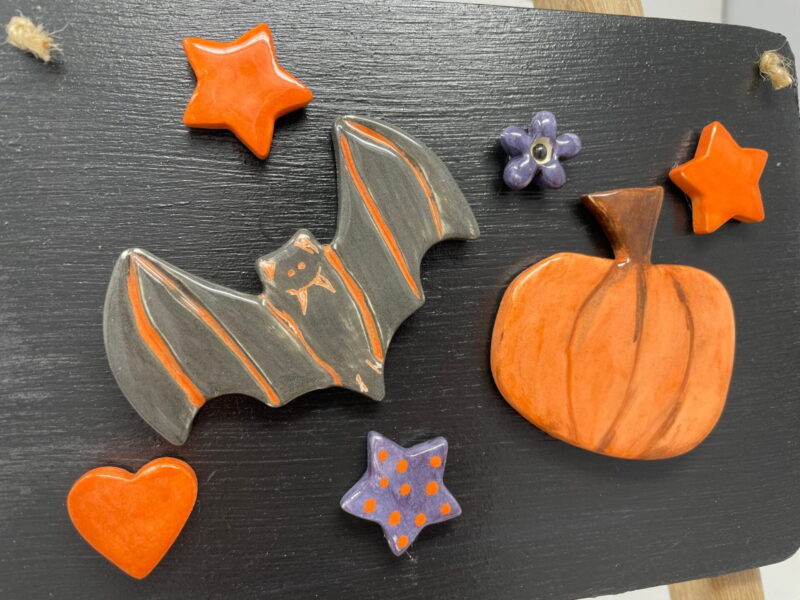 Each piece is meticulously crafted from white earthenware clay, painted with underglaze paint in vivid hues that capture the essence of Halloween. A layer of transparent glaze adds a glossy finish for long-lasting brilliance. The magnetic board is a black metal sheet varnished with durable lacquer, ensuring its beauty stands the test of time.