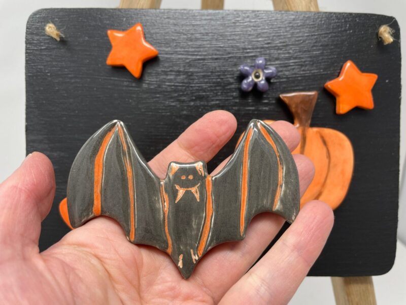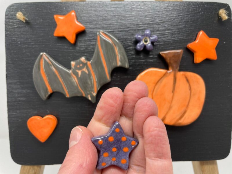 Introduce a touch of whimsy to your home this fall with our set of seven Halloween ceramic magnets. This enchanting assortment includes a jovial pumpkin, a mysterious bat, three twinkling stars, a vibrant purple flower, and a heartfelt orange love heart — an eclectic mix to delight the eye and uplift the spirit.