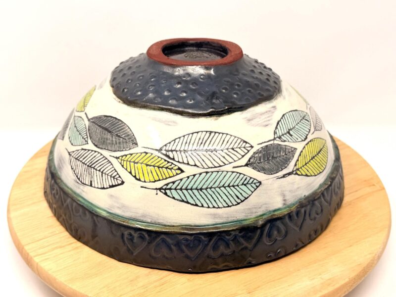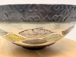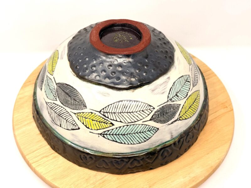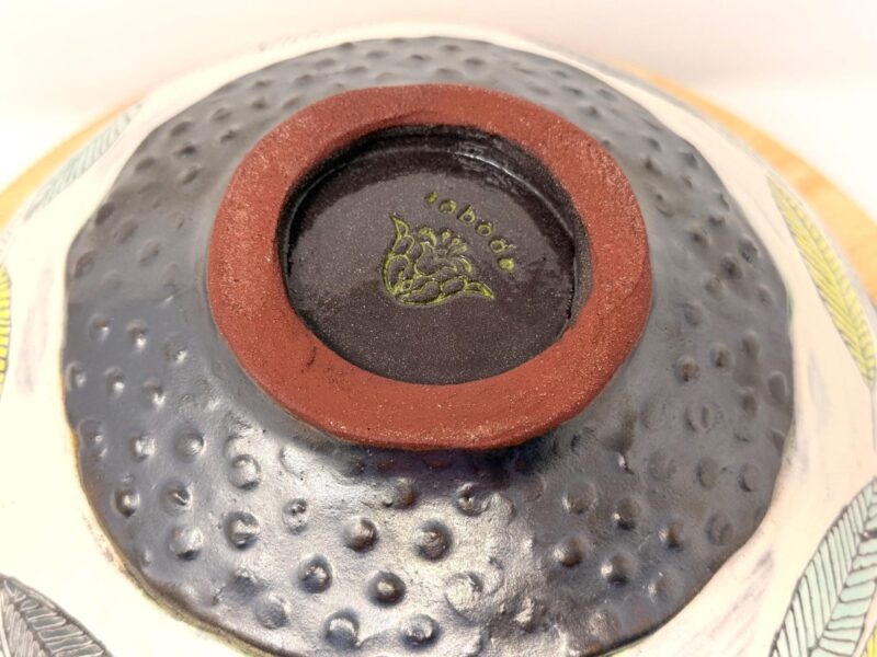 Colors: Light blue reactive interior glaze, ivory slip exterior with green and blue botanical details, graphite black glazed rim