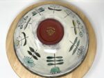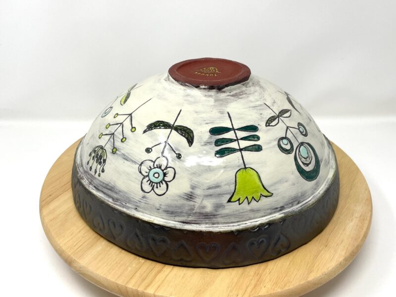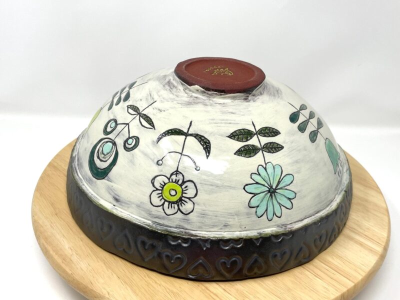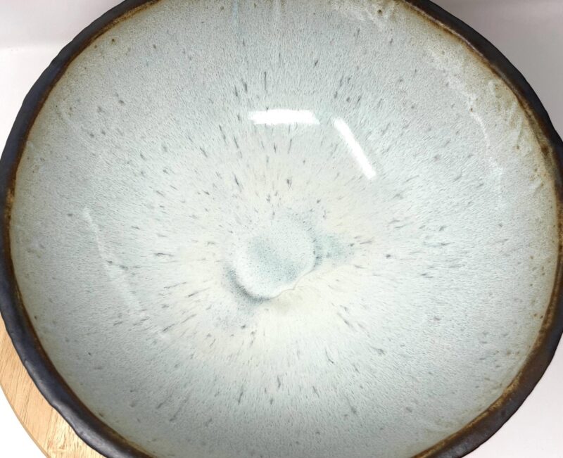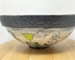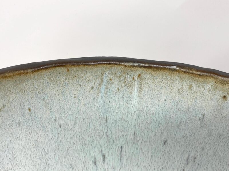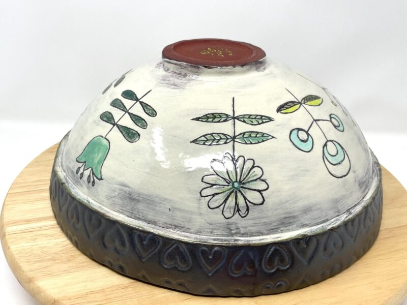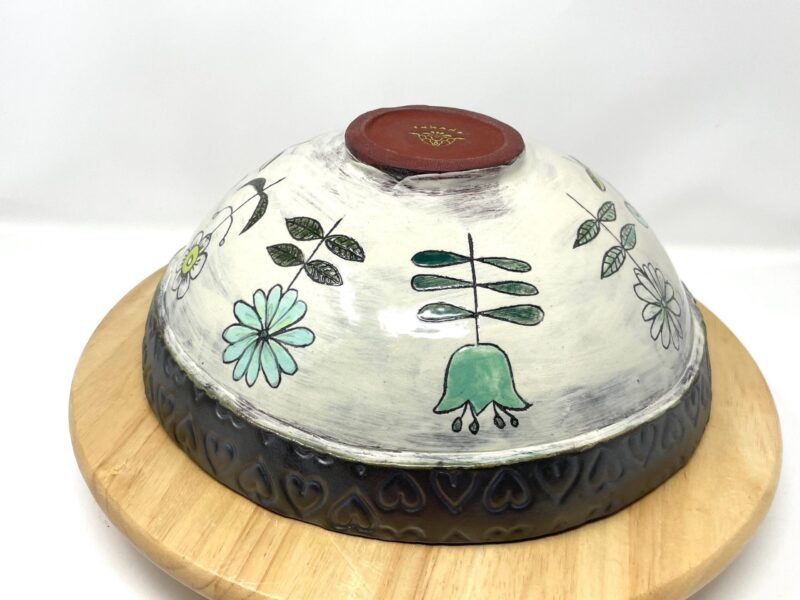Colors: Light blue reactive interior glaze, ivory slip exterior with green and blue botanical details, graphite black glazed rim