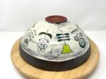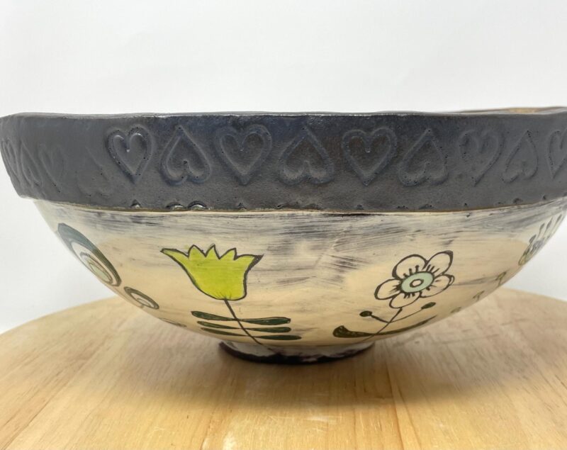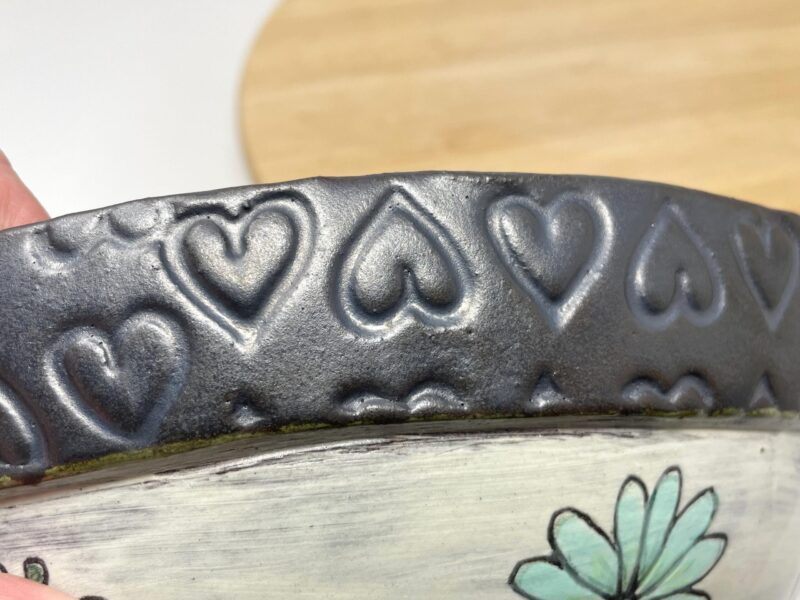 The distinctive rim is textured with little heart outlines and finished with a graphite black glaze, adding elegant contrast to the piece’s rustic character. Each element of this bowl reflects the handmade process, celebrating the beautiful imperfections and character that can only come from artisan craftsmanship.