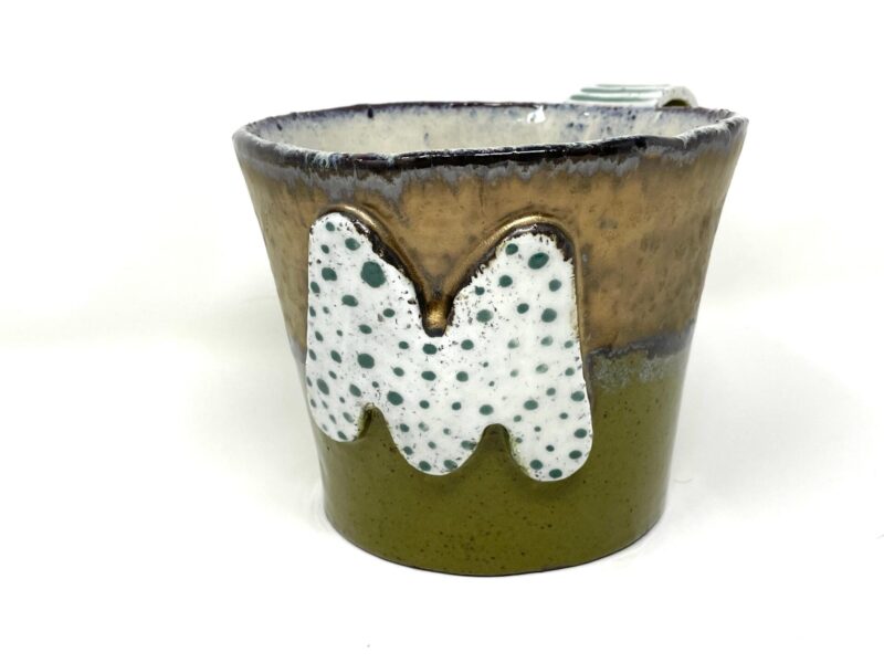 • Personalized Touch: Adorned with a stylish "M" letter, featuring green polka dot design on a white background