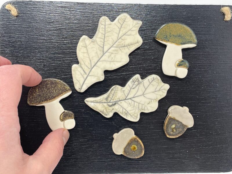 This magnet set is more than just an ornament; it's a piece of art that brings the magic of autumn into your home. Whether you're looking for an eye-catching addition to your own decor or seeking a thoughtful gift for someone special, this Handmade Ceramic Acorns Mushrooms and Autumn Oak Leaves Magnet Set is sure to impress. Experience the beauty of nature all year round with this charming autumn decor.
