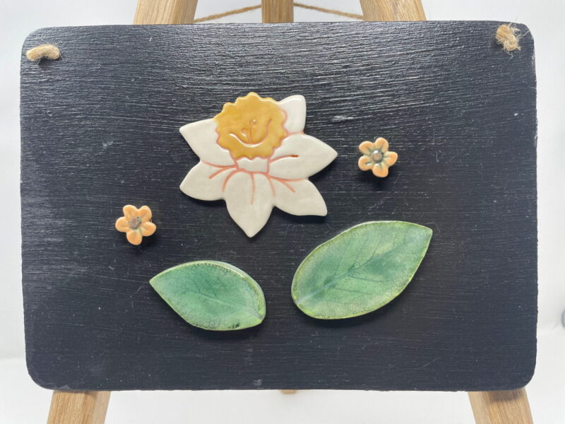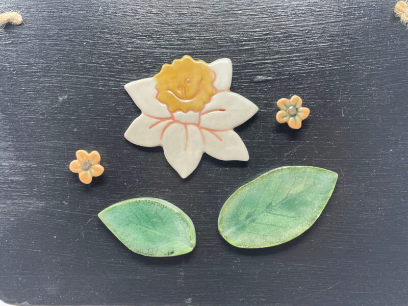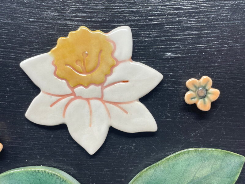 Step into the magical world of spring with our delightful Handmade ceramic daffodil fridge magnet in a set with flowers and green leafs. These eye-catching fridge magnets will bring a touch of whimsy and colour to your home, with the vibrant shades of green, yellow, and orange bouncing off the delicate ceramic magnet set.