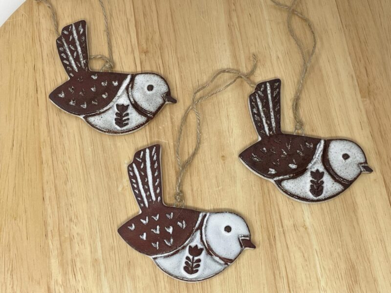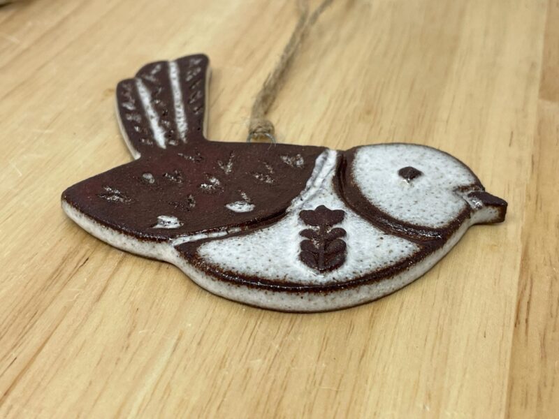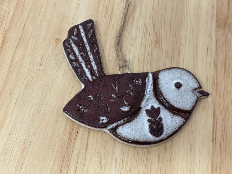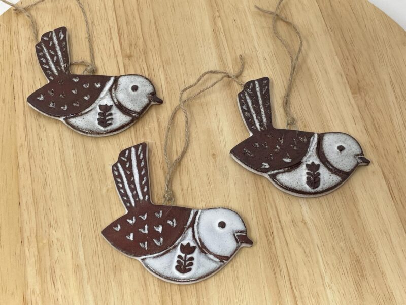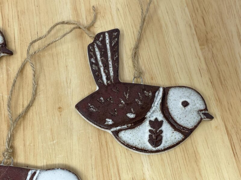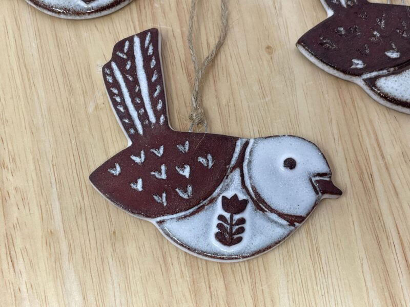 The ornament begins as a hand-rolled sheet of rich terracotta clay, carefully cut into a graceful bird shape. The surface is then intricately carved, bringing the bird to life with texture and dimension. There is a small metal nichrome wire pushed into the clay for easy hanging.