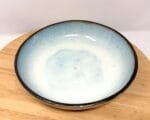 The bowl features a single foot rim at the base, allowing it to be glazed on both sides. Inside, a stunning reactive glaze creates a beautiful gradient from white to light blue, darkening gently toward the rim. The rim is finished with a graphite black glaze that adds an elegant shine and contrast.