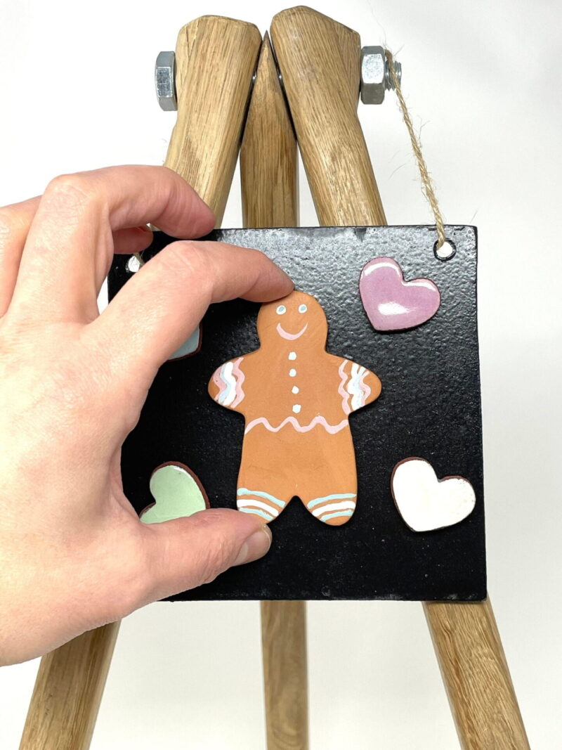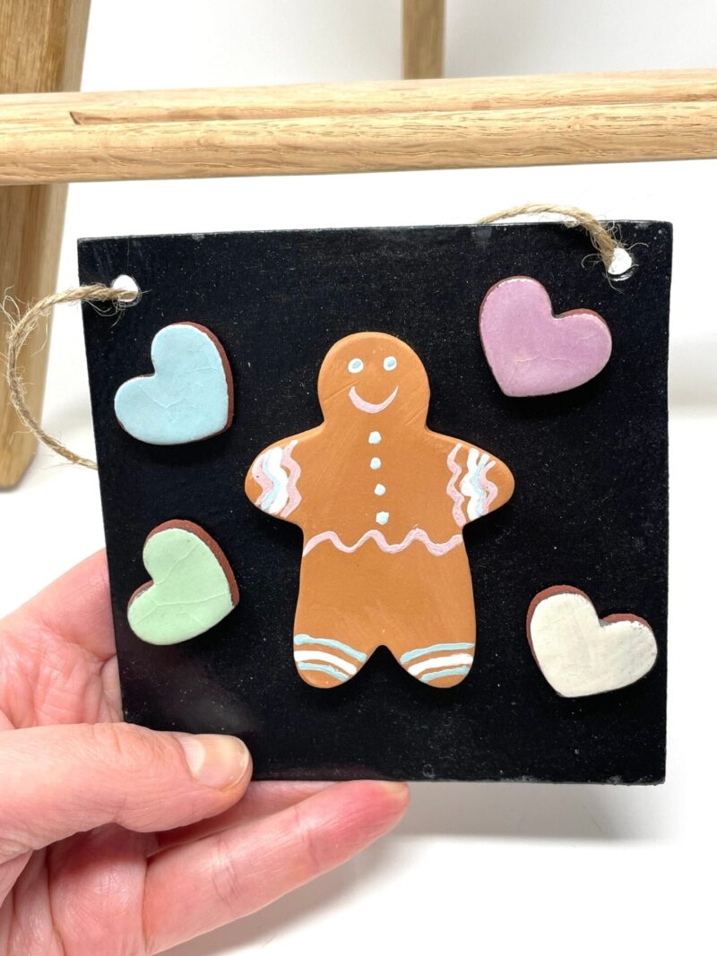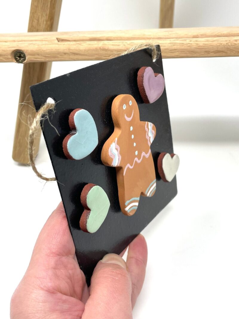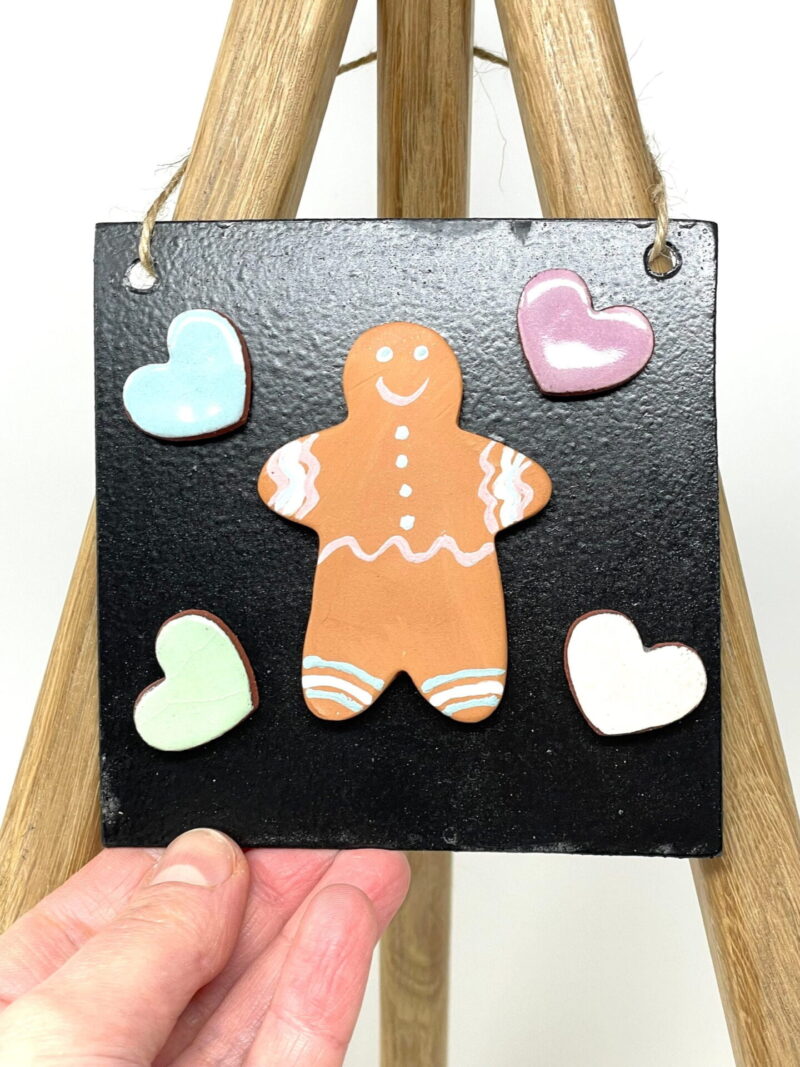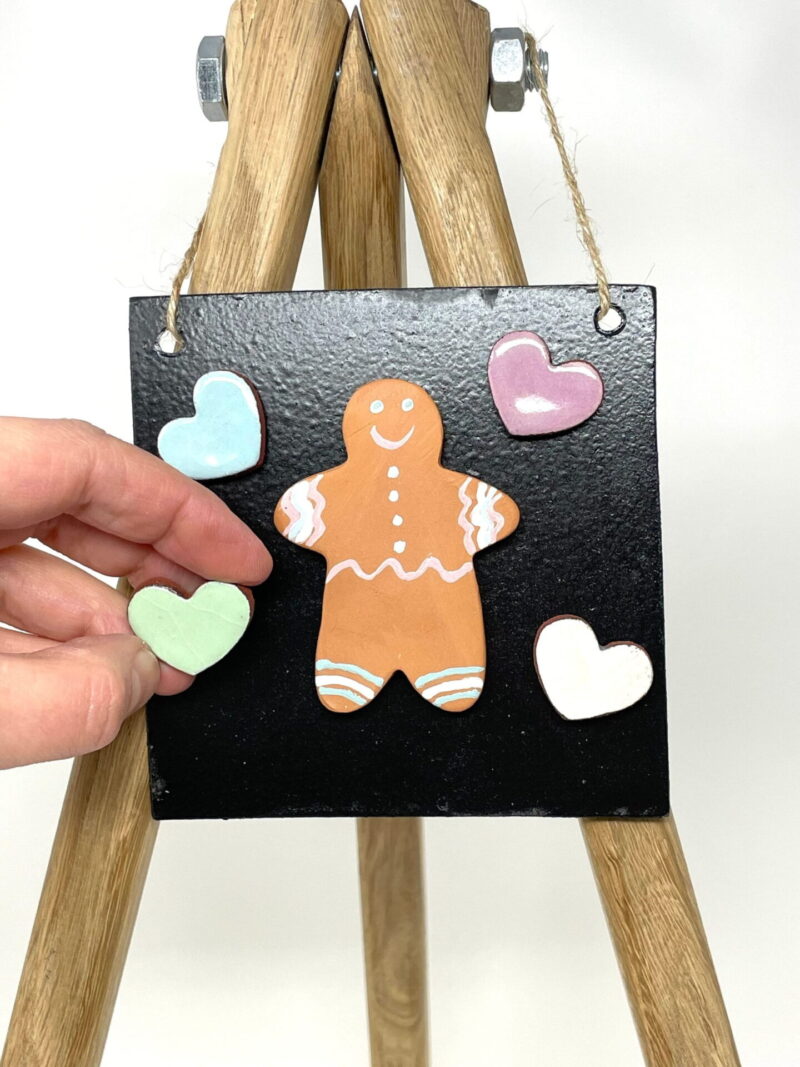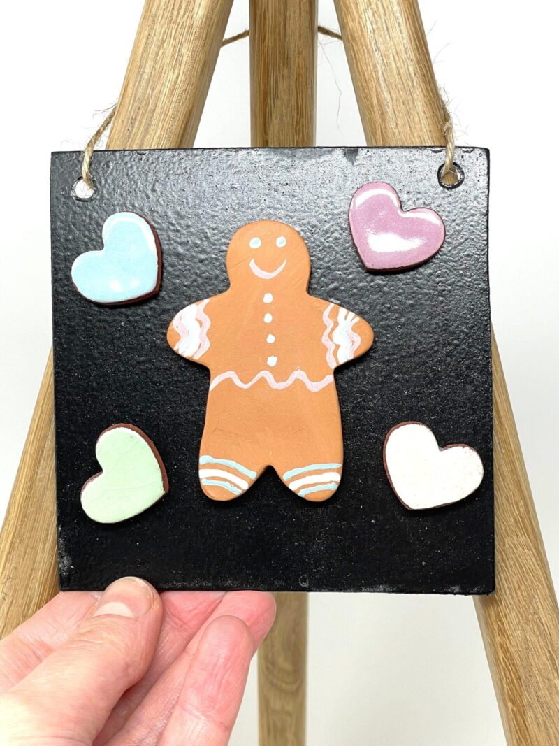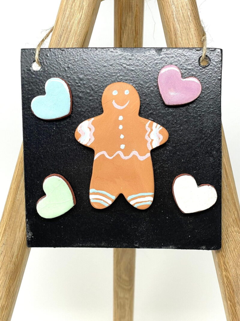 The magnets are crafted from terracotta clay and meticulously hand-painted with underglaze paint, each ceramic magnet is a unique work of art. The set includes a delightful gingerbread man and four small hearts glazed in white, pink, light blue, and light green. The unglazed gingerbread man adds a rustic touch to the set, while the glazed hearts bring vibrant pops of colour.