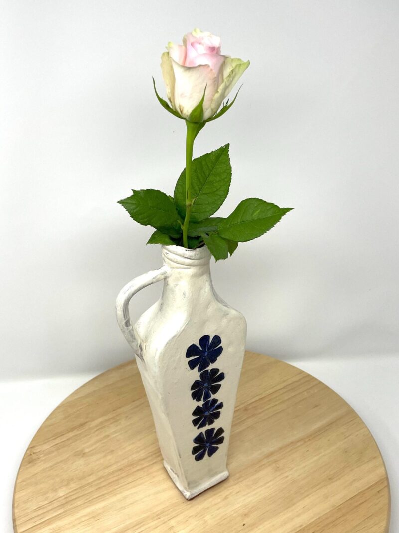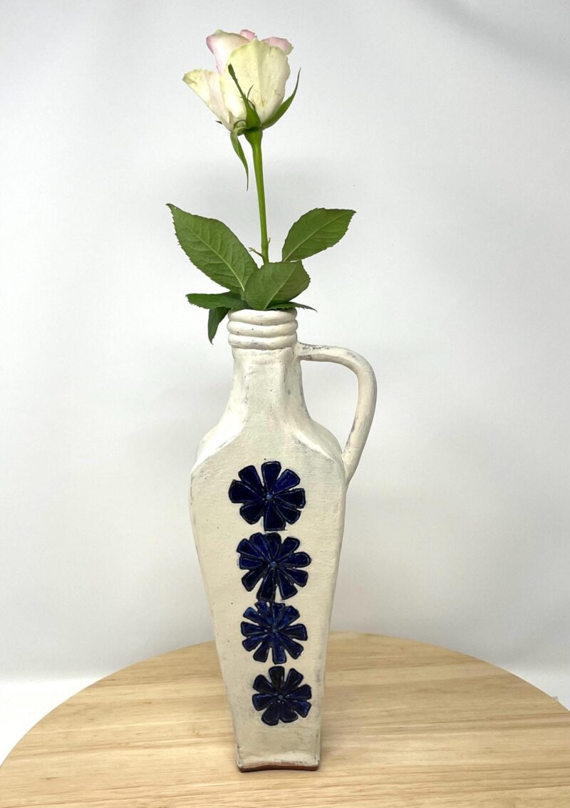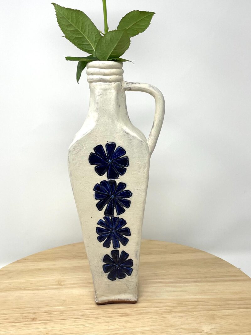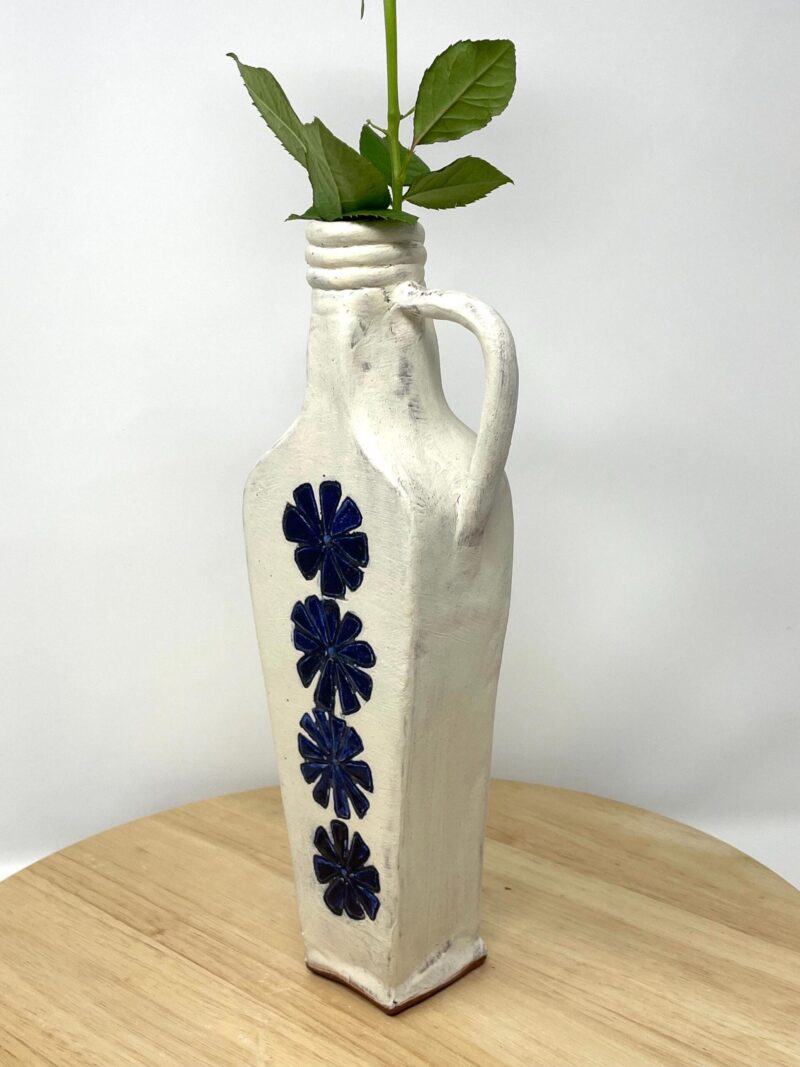 Add a touch of handcrafted elegance to your space – order your rustic ceramic vase with its beautiful white matte exterior and cobalt blue floral accents today!