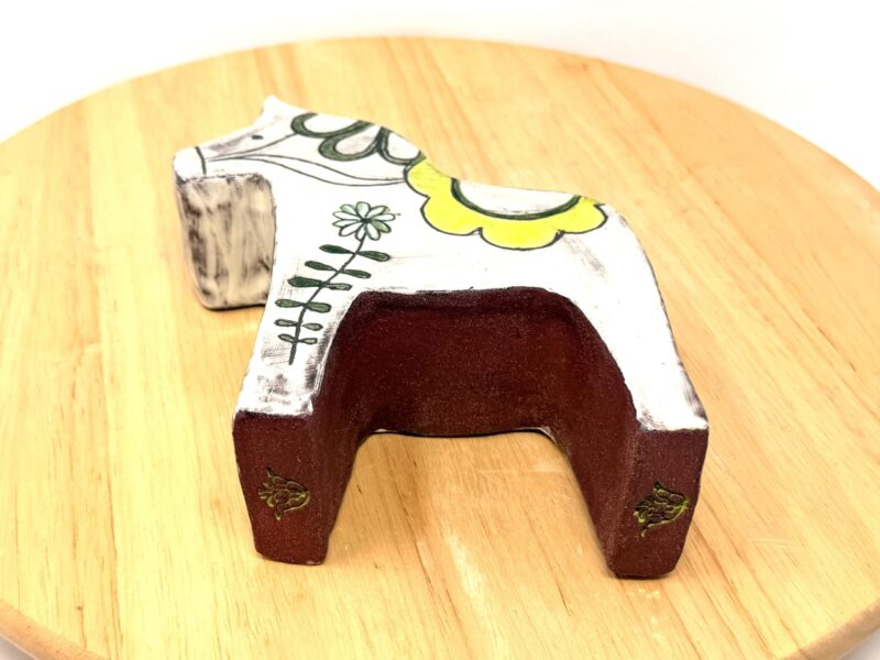This charming miniature Dala horse adds a touch of Scandinavian-inspired artisanal beauty to any space. Its rustic terracotta base, paired with the white slip exterior and colorful sgraffito decorations, creates a stunning visual appeal. The transparent glaze creates a glossy surface. The unique DALA horse shape adds character and charm, making it a conversation piece in any setting.