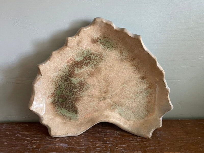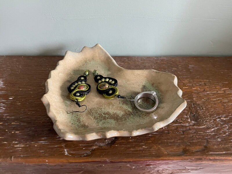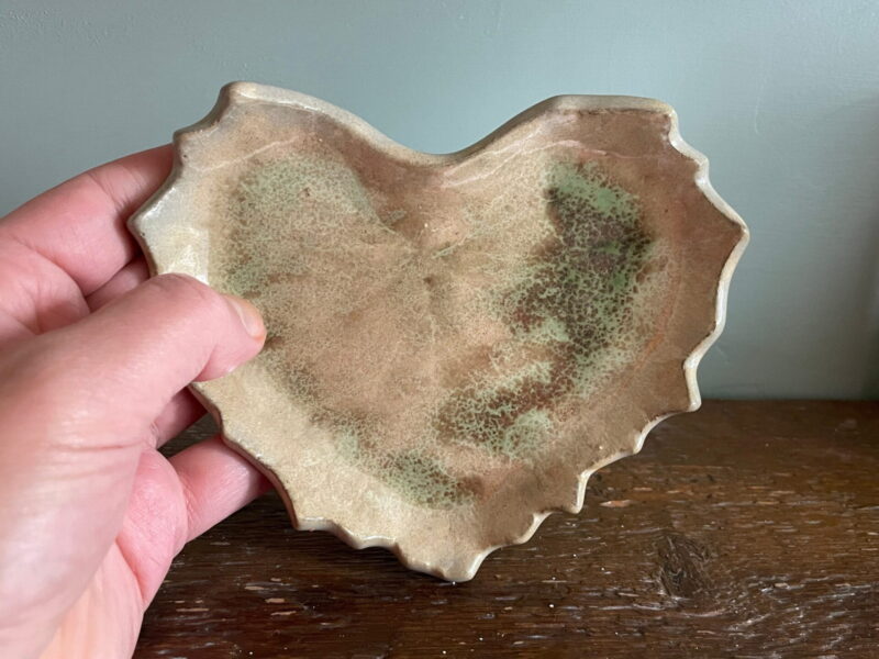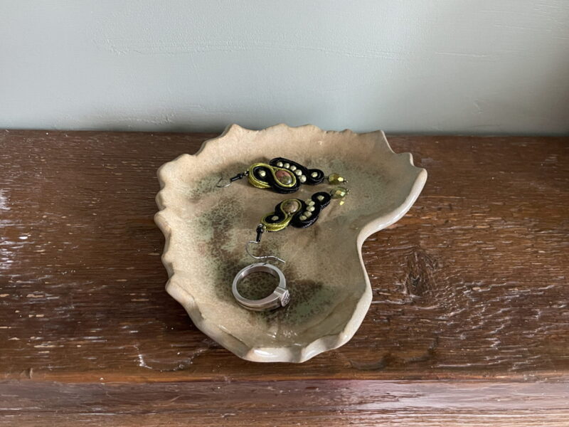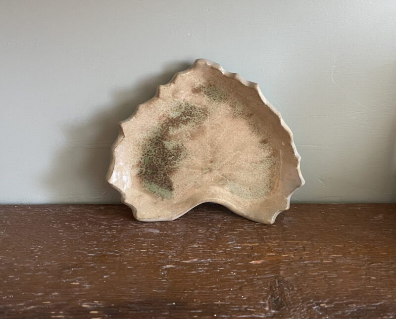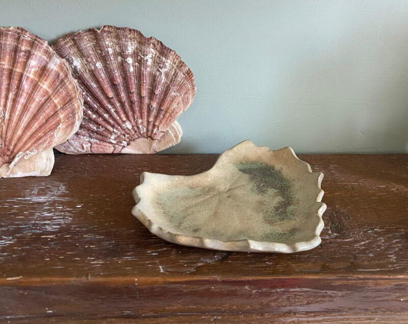 Introducing our stunning handmade pottery autumn shades ceramic leaf shaped soap dish/trinket dish! Crafted with love and attention to detail, this unique piece is made of smooth grey clay and adorned with captivating light green glaze and darker green patches of glazes, adding depth and beauty to any space. The back is also glazed in one greyish green colour, showcasing its natural elegance. Versatile and practical, it can hold your bits and bobs, serve as a stylish jewellery holder, a convenient spoon rest, or even a small soap dish. Elevate your home decor with this exquisite autumn coloured leaf bits and bobs holder. Embrace nature's beauty with this charming pottery treasure.