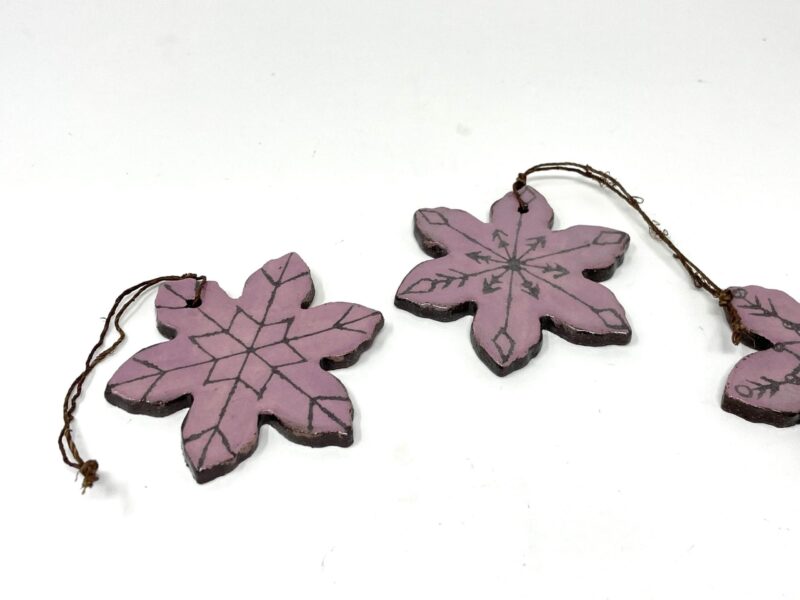 I begin with high-quality terracotta clay, shaping each ornament by hand. A soft mauve pink slip is then applied as a base, creating a beautiful canvas for the intricate scratched designs. The natural terracotta peeks through in strategic areas, enhanced by a transparent glaze that brings out the clay's rich chocolate brown tones. This interplay of colors and textures results in ornaments that are both visually stunning and tactilely pleasing.