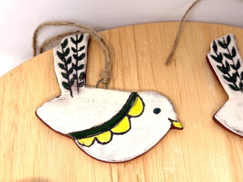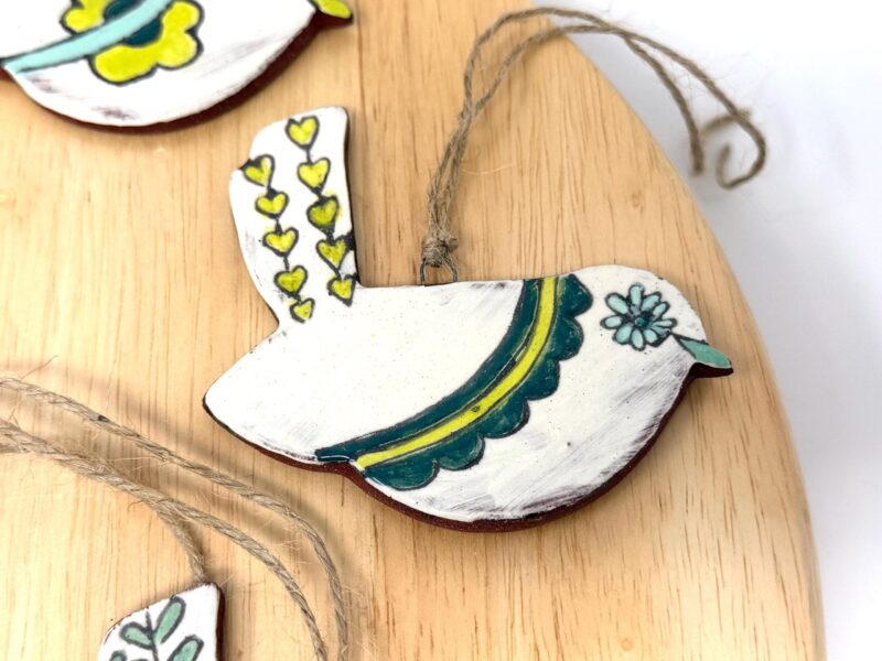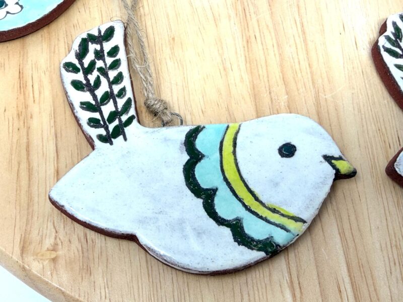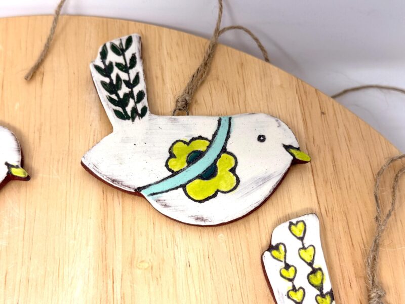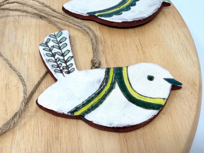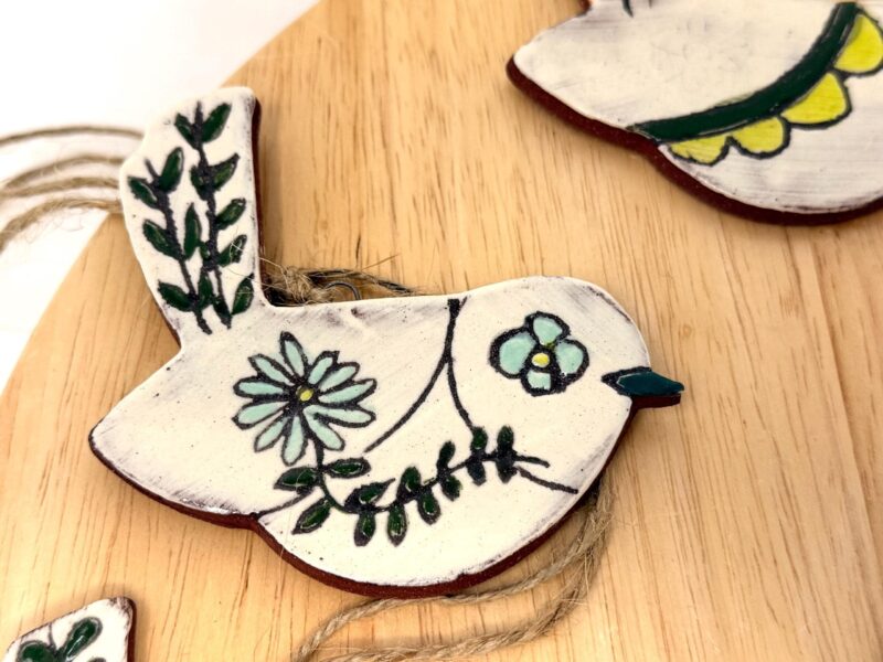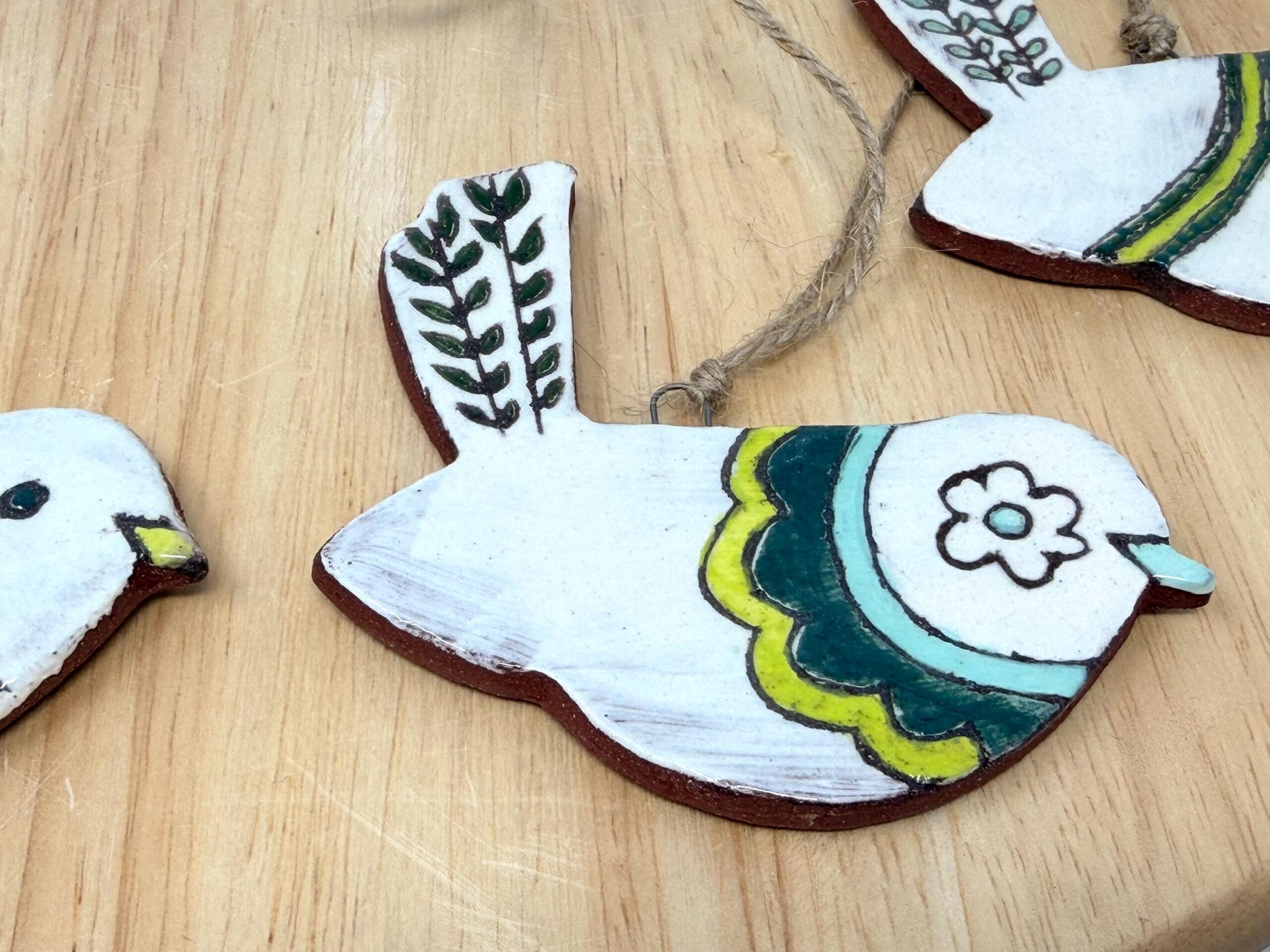 Add a touch of rustic charm to your home with these handmade terracotta bird ornaments. Each bird is crafted from rustic terracotta clay, shaped and smoothed by hand, then decorated with a brushed white slip surface. Using the traditional sgraffito technique, intricate designs are scratched into the clay and hand-painted in soothing shades of green and blue, making every piece truly one-of-a-kind.