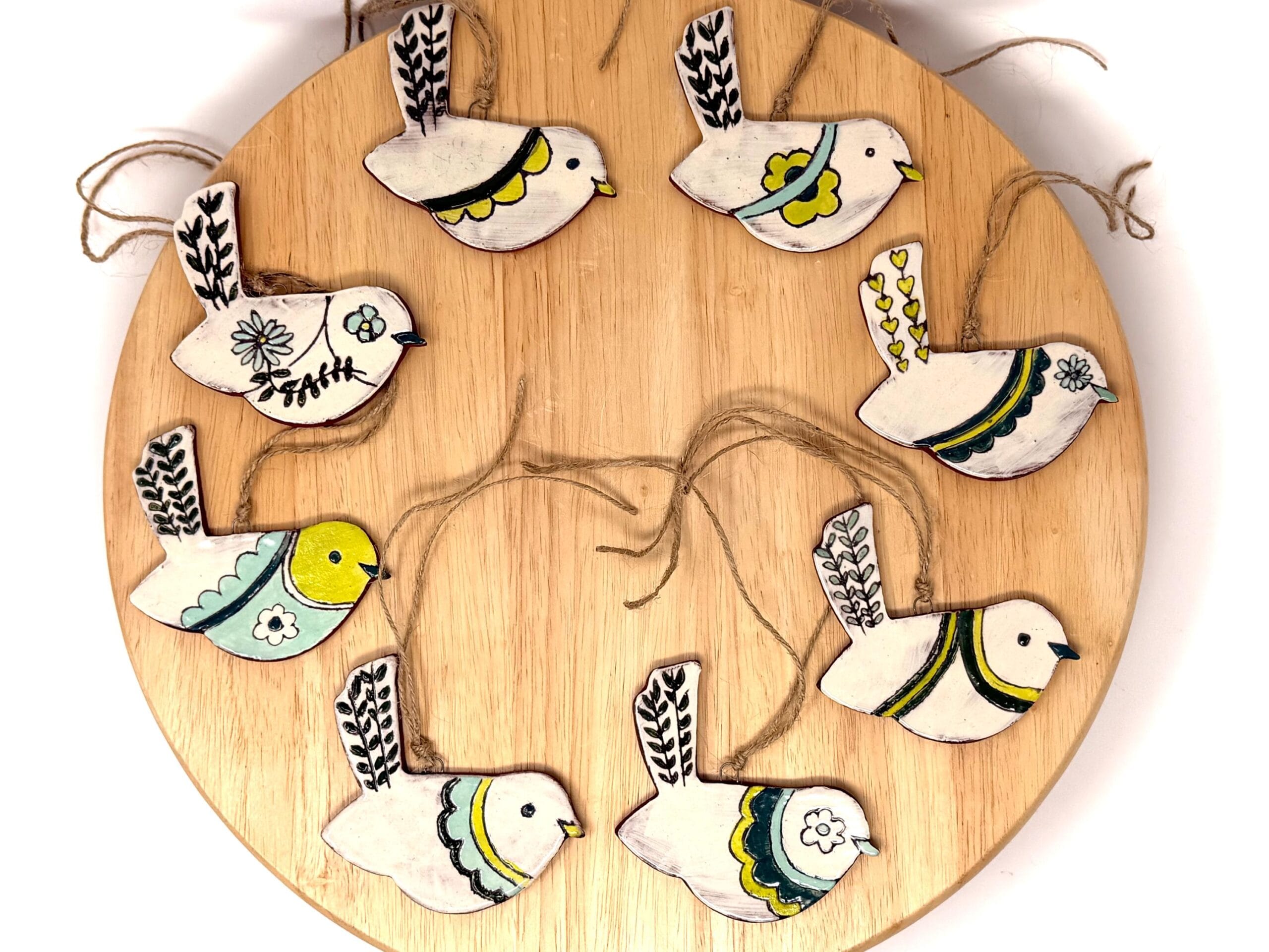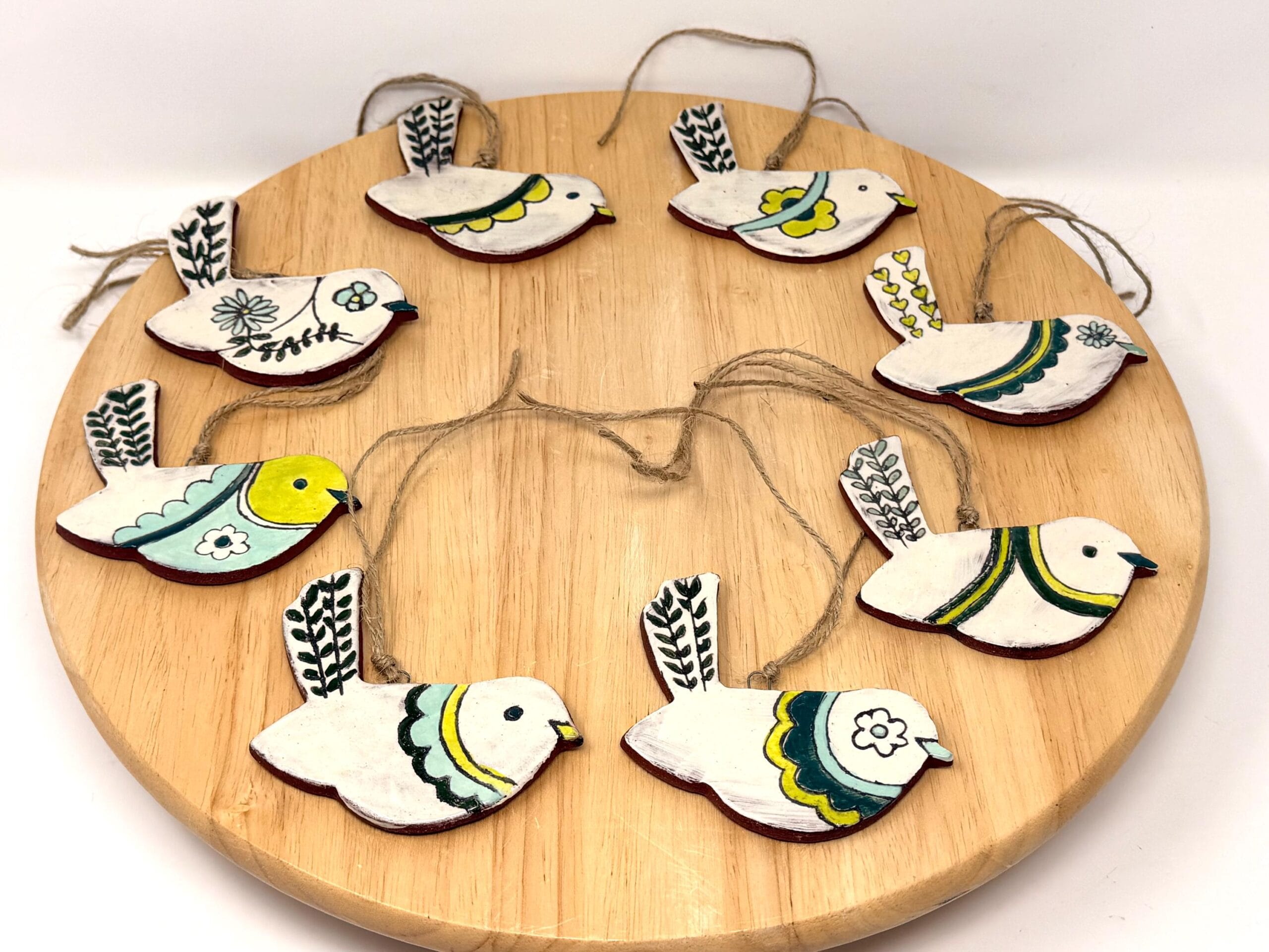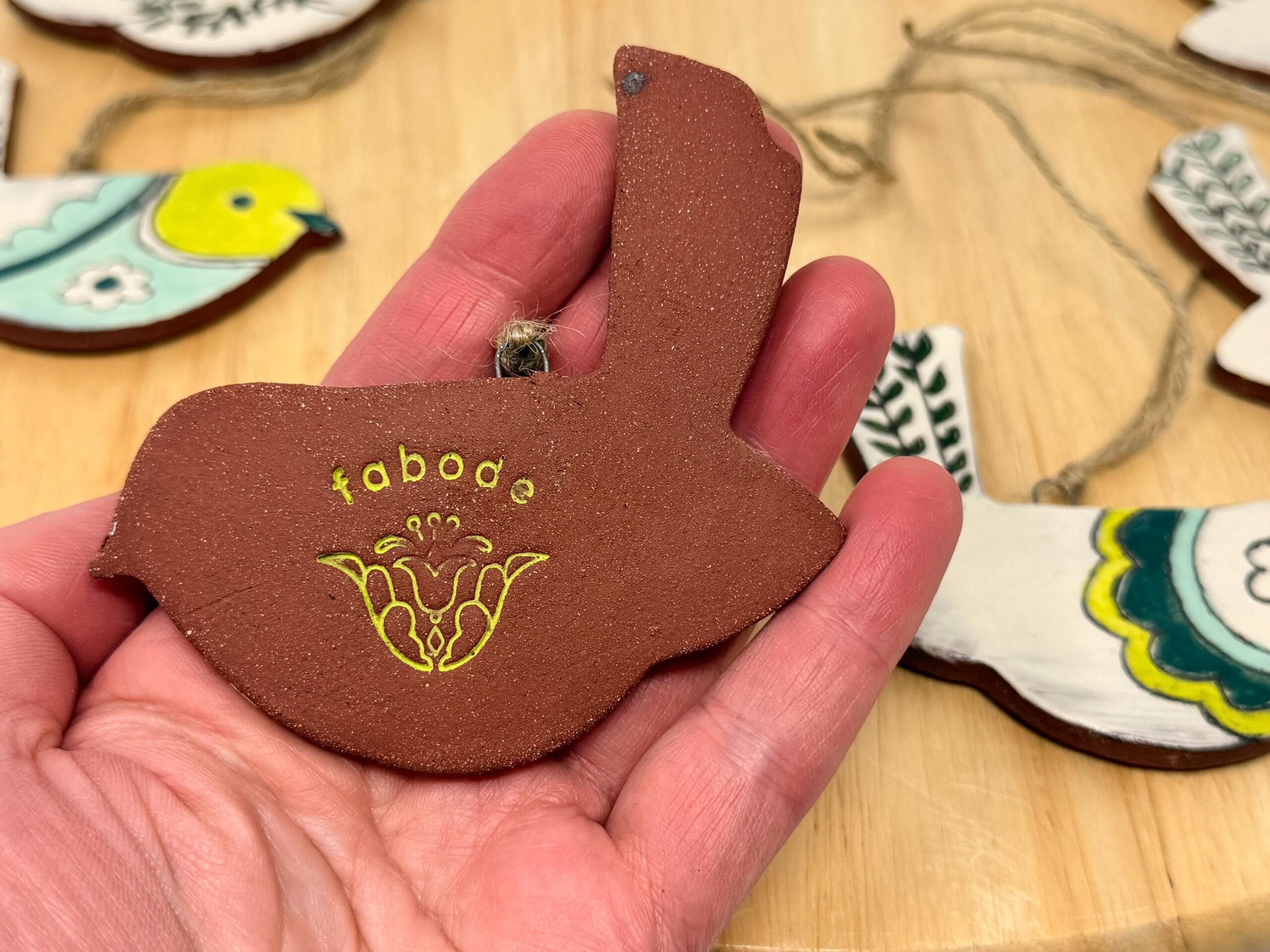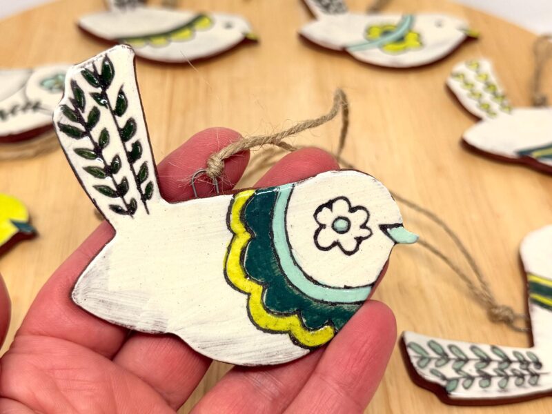 Add a touch of rustic charm to your home with these handmade terracotta bird ornaments. Each bird is crafted from rustic terracotta clay, shaped and smoothed by hand, then decorated with a brushed white slip surface. Using the traditional sgraffito technique, intricate designs are scratched into the clay and hand-painted in soothing shades of green and blue, making every piece truly one-of-a-kind.