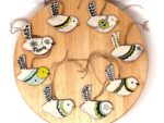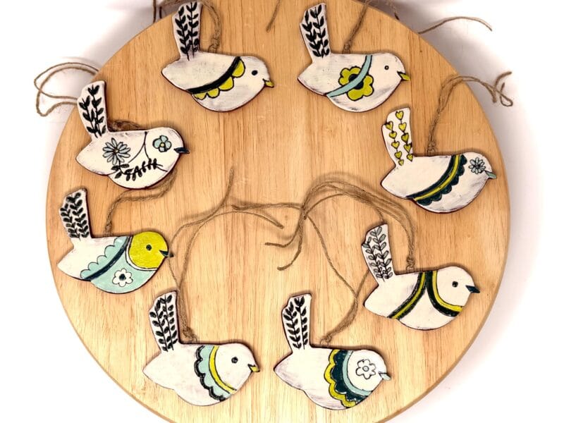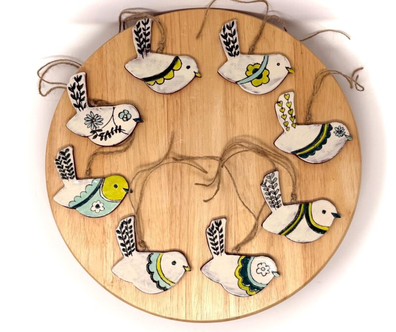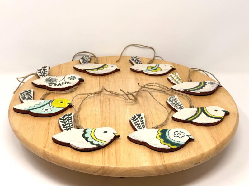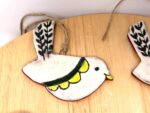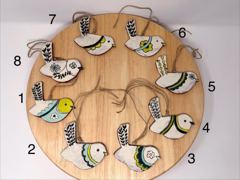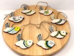 Perfect for hanging on walls, doors, or windows, these lightweight ceramic birds come with a sturdy metal hanger and natural twine for easy display. Choose from 8 unique designs, each featuring its own distinct pattern and personality. The maker’s logo on the back guarantees authenticity and artisan quality.