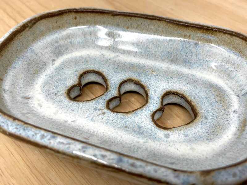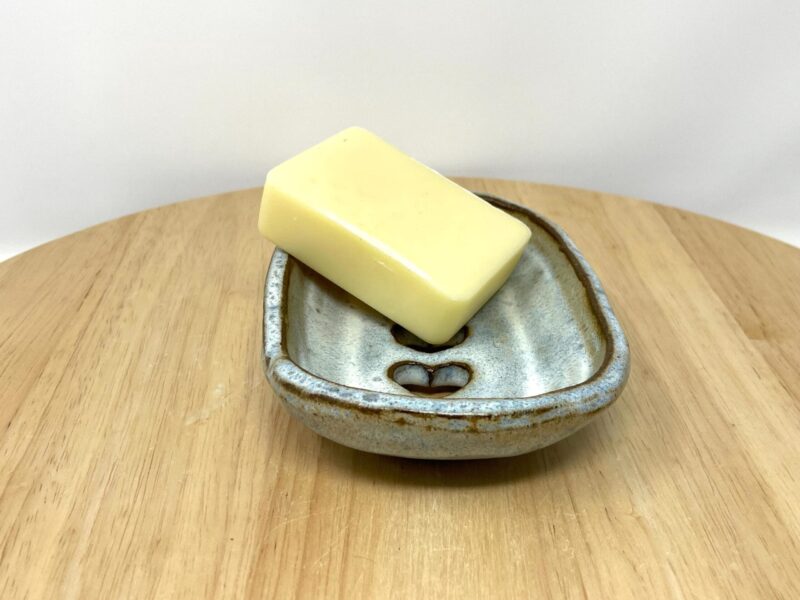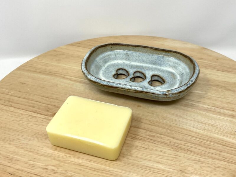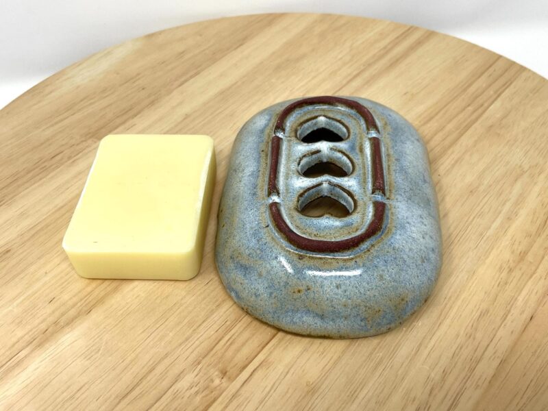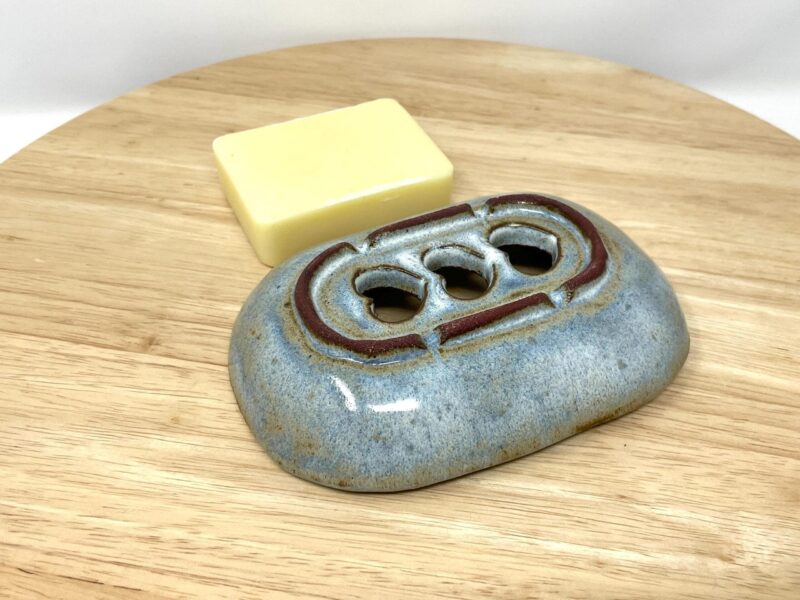 The soap dish is beautifully glazed in a light blue reactive glaze that breaks to a rich coffee brown over the edges, creating a stunning visual effect. This interplay of colors adds depth and visual interest to your bathroom decor, making it a true statement piece.
