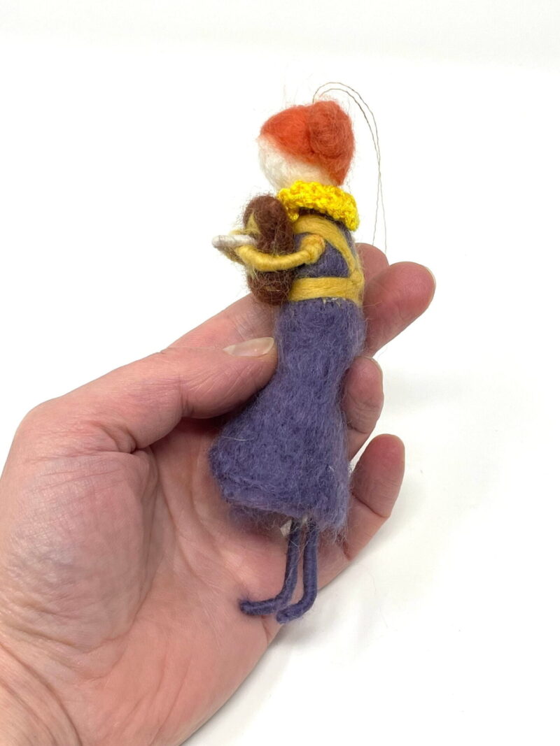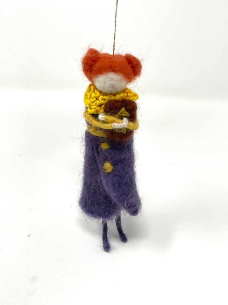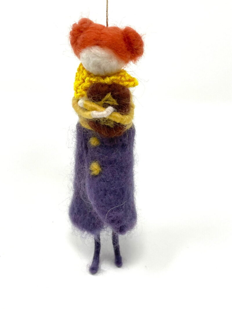 The flexibility of her wire skeleton allows you to pose her arms and legs, infusing life and character into this charming piece. Whether gracing your Christmas tree with its golden string or perched on a shelf as a year-round nod to academia, this wool ornament brings joy and nostalgia to any space.