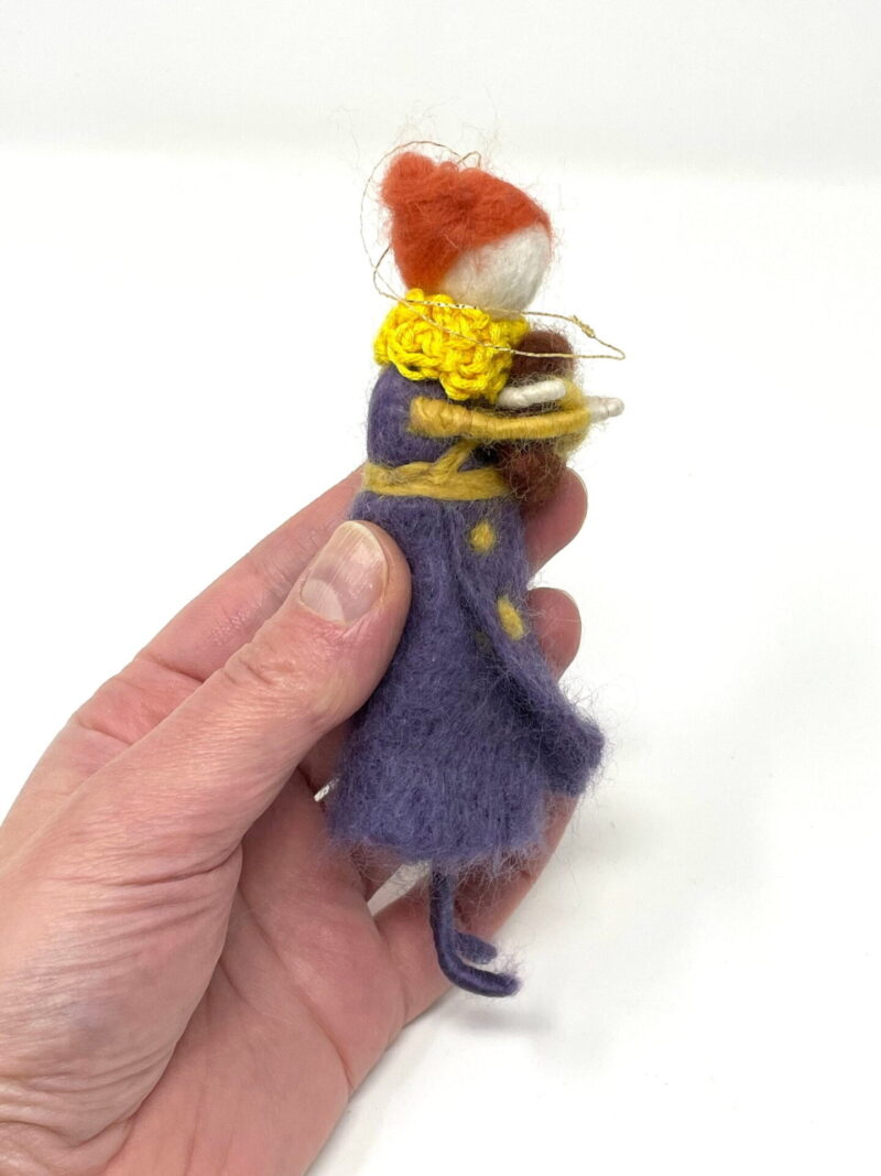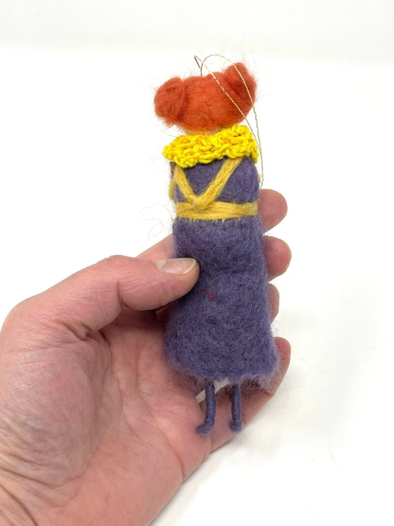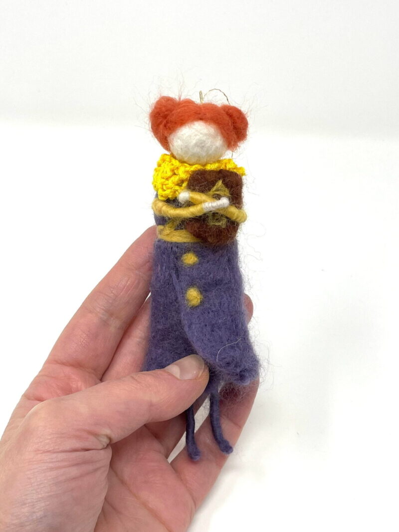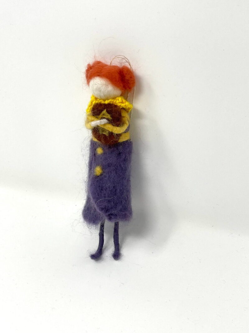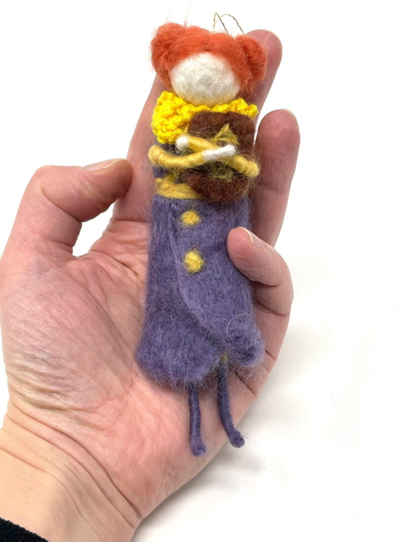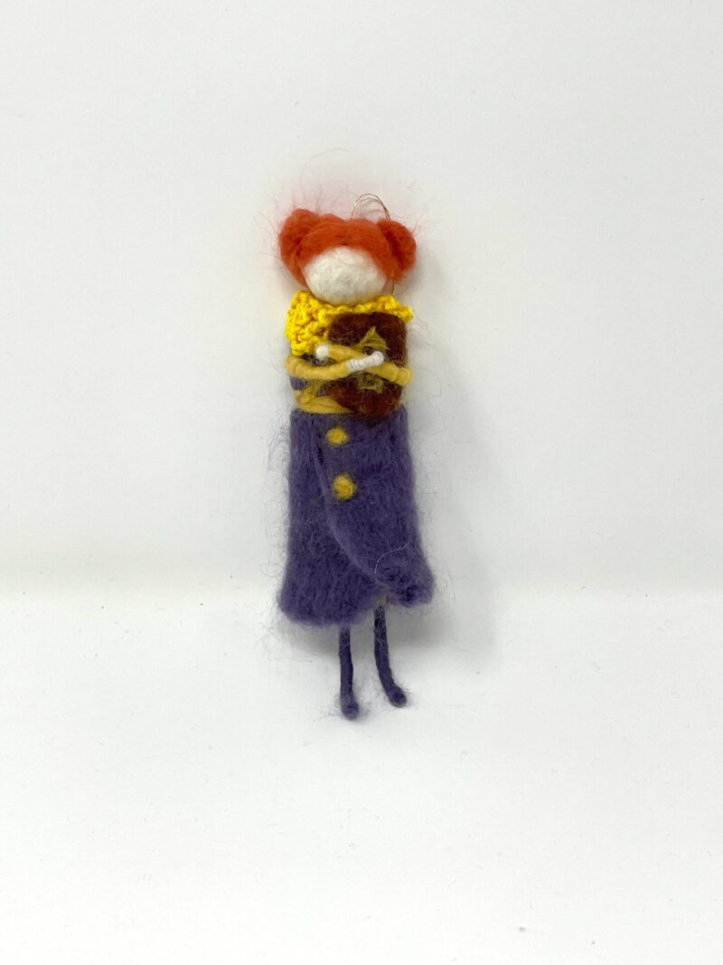 Adorned in a vibrant purple dress accented with sunny yellow sleeves and intricate embellishments, this needle felted creation boasts a quaint aesthetic that is both heartwarming and inspiring. The ginger-haired educator, with her hair neatly styled into twin buns and framed by a cozy yellow crochet scarf, embodies the nurturing spirit of teachers everywhere.