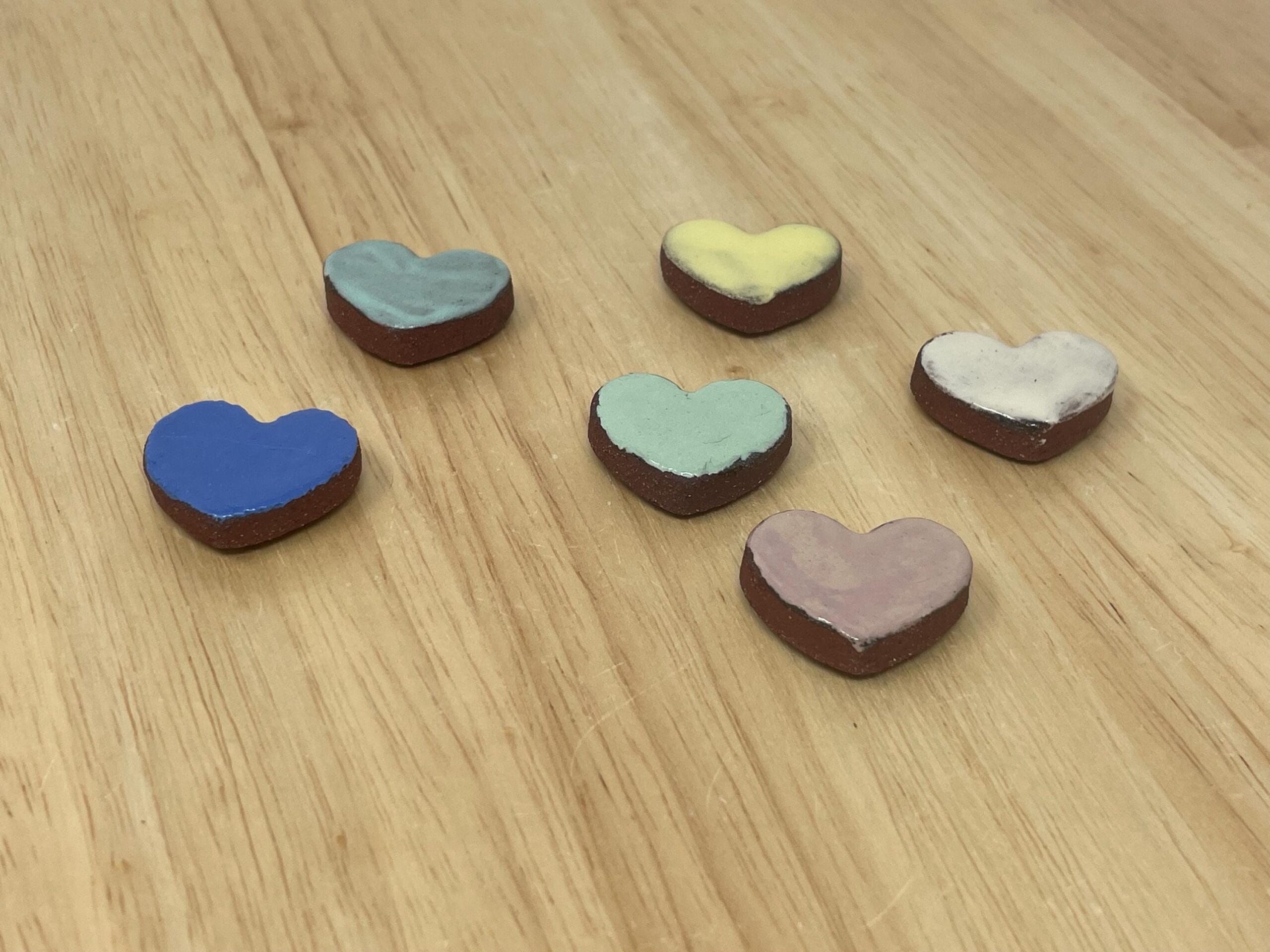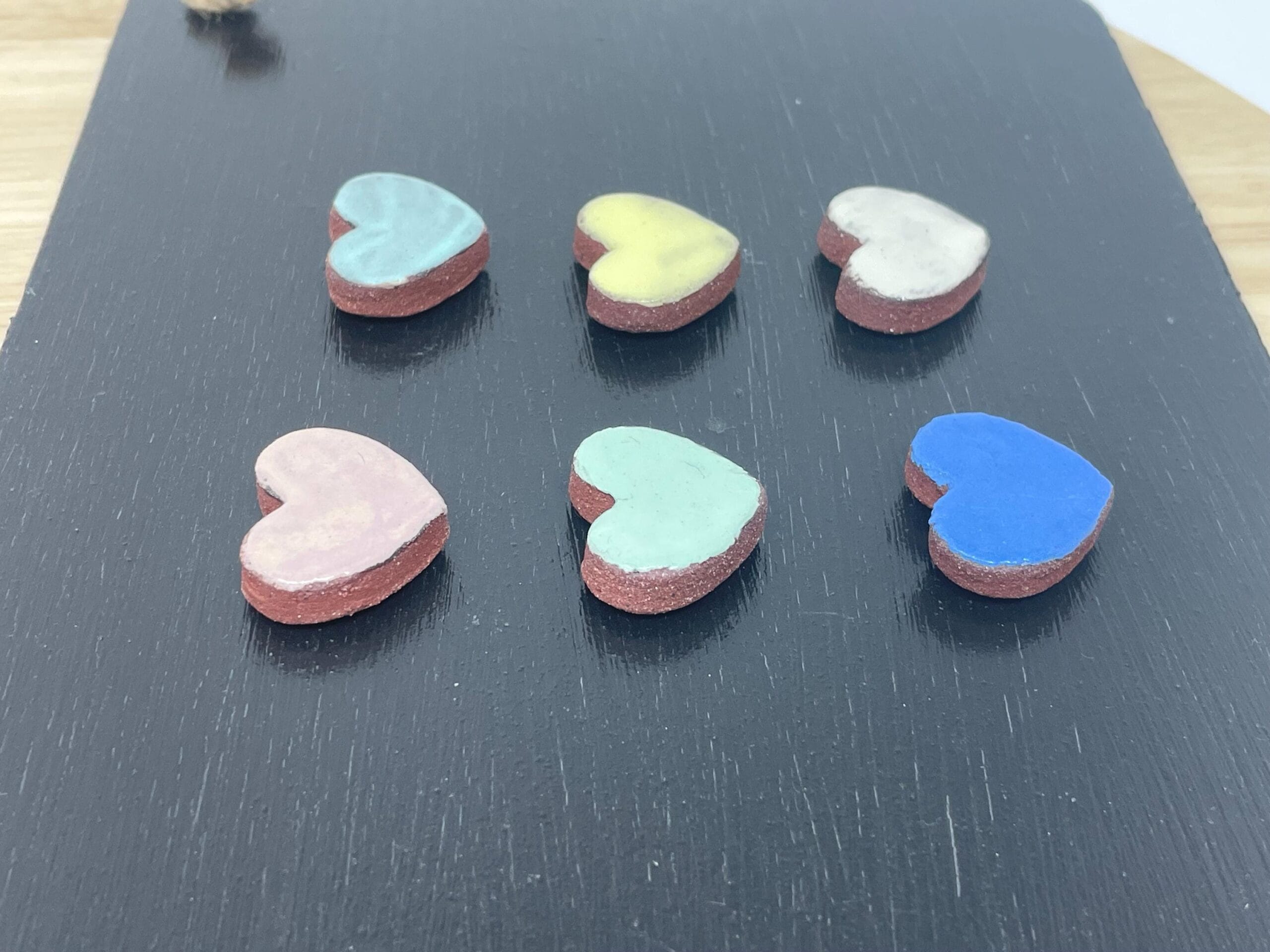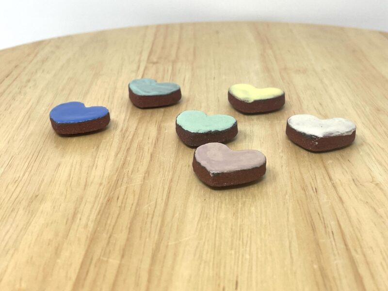 Each heart is handmade from high-quality terracotta clay, carefully cut and painted with underglaze before being fired once to set the colours. A layer of transparent glaze is then applied, and the hearts are fired again at a high temperature to ensure their durability and longevity.