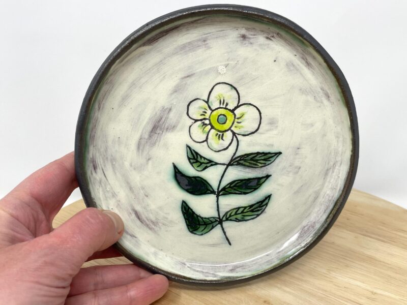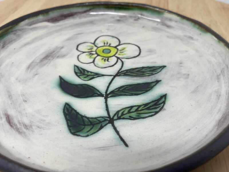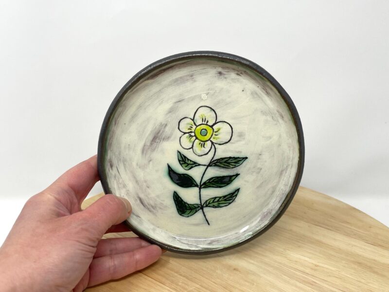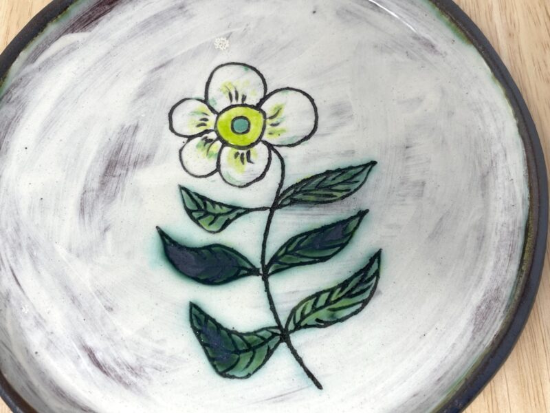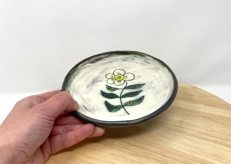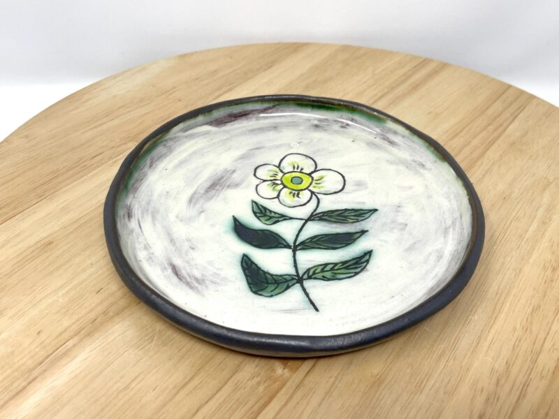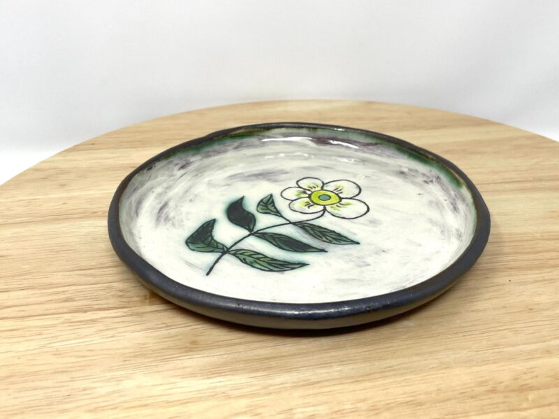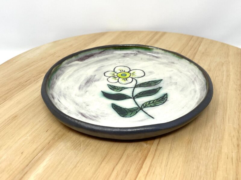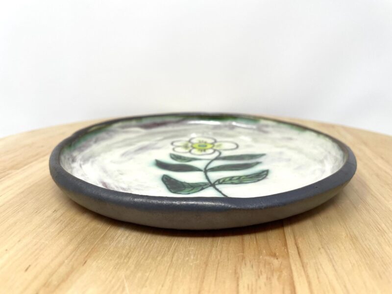 This exquisite small plate showcases the beauty of traditional craftsmanship. The surface boasts a smooth ivory finish, achieved by brushing white slip under a transparent glaze. The centerpiece of the design is a delicate flower, meticulously scratched into the surface and brought to life with vibrant green and blue hues.