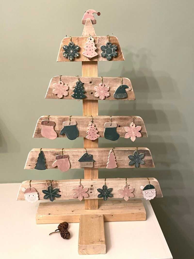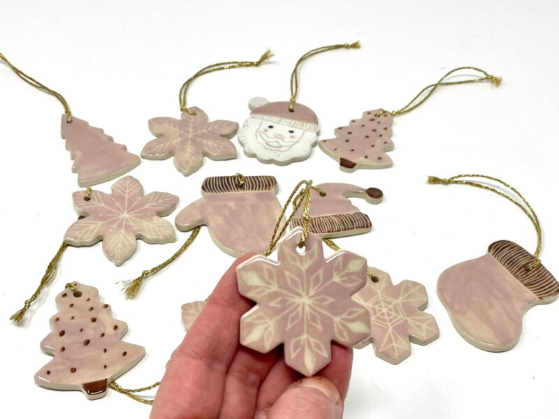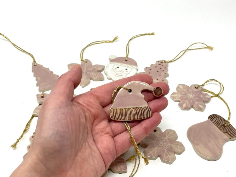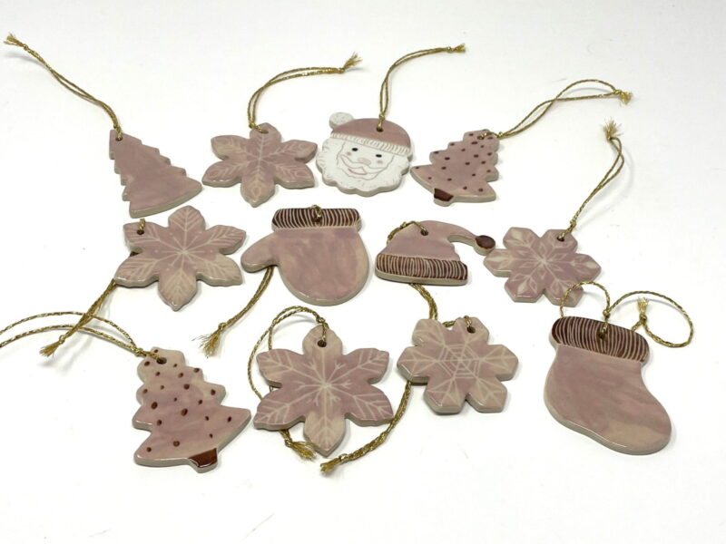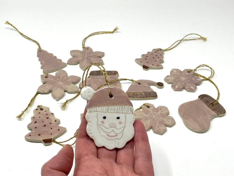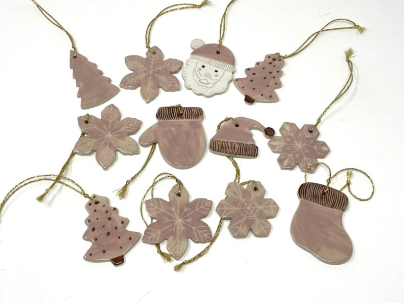 - 9 Handcrafted ceramic ornaments, including a Santa Claus with a pink hat