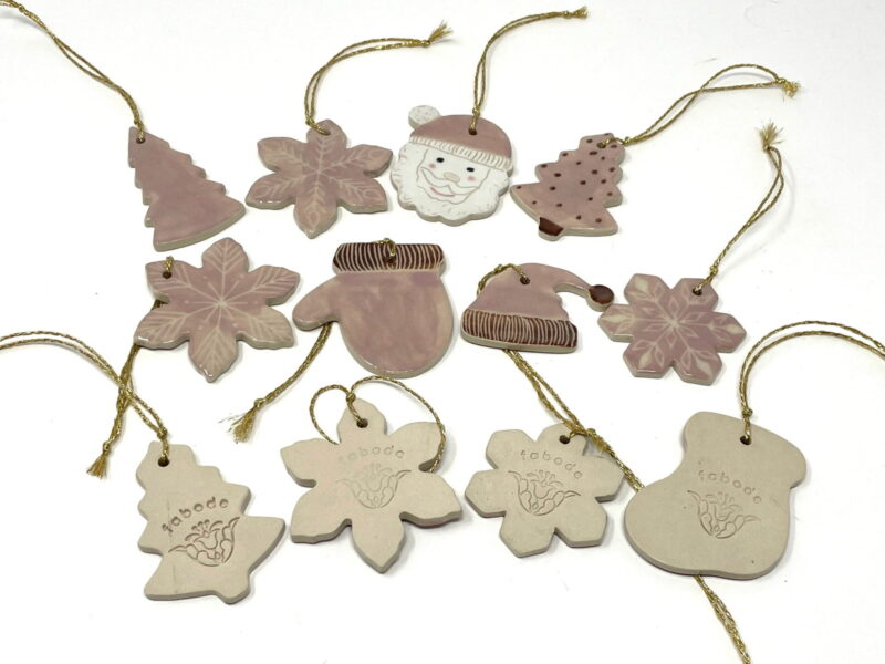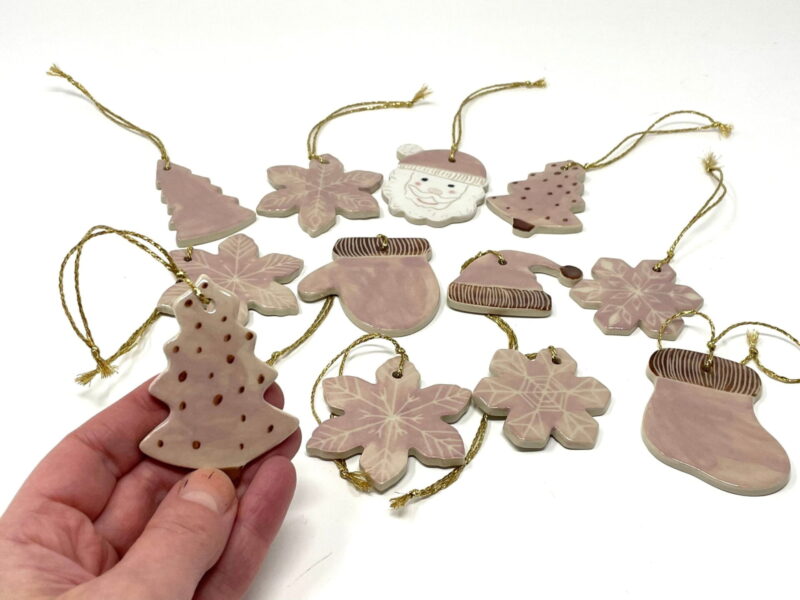 I begin with high-quality white stoneware clay, shaping each ornament by hand. A beautiful pink underglaze is then applied as a base, creating the perfect canvas for intricate scratched designs. After the initial firing, a transparent glaze is applied, and the pieces undergo a second firing. This process ensures durability and brings out the vibrant pink color while highlighting the charming chocolate brown accents.