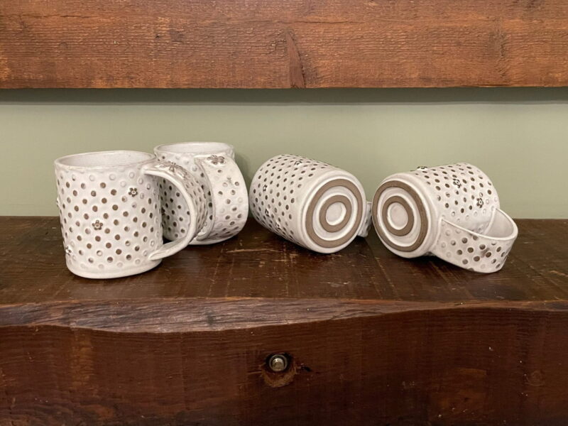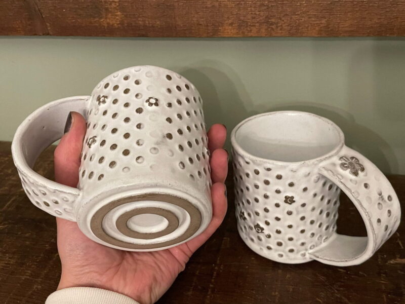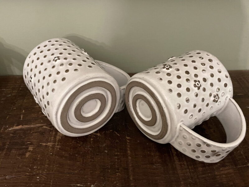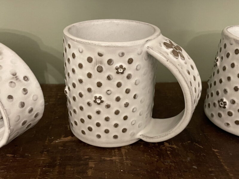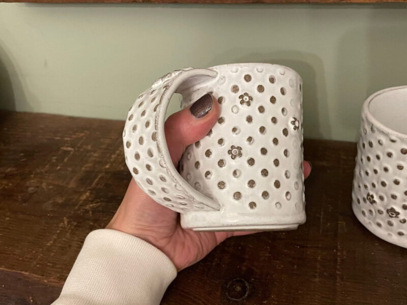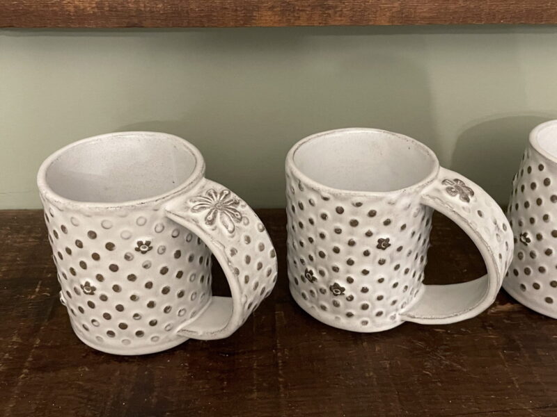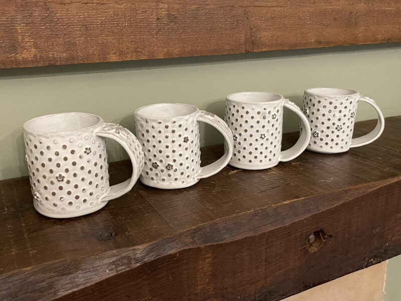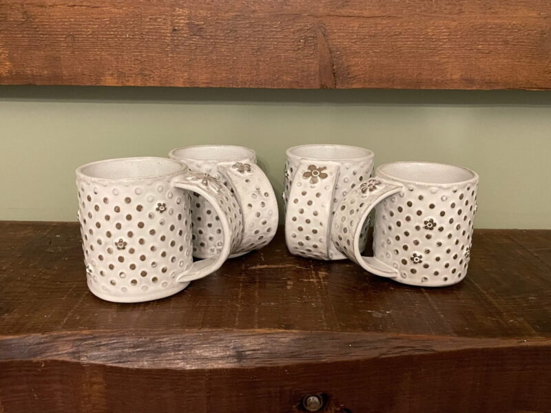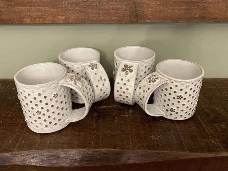Introducing our Set of 4 * 0.3 l white handmade ceramic pottery mugs with a delightful dotted texture and charming tiny flower deco. Each mug is meticulously hand built from grey clay, resulting in beautifully imperfect and unique shapes. The wide, textured handles provide a comfortable grip, while the attached flowers add a touch of whimsy. Indulge in the tactile pleasure of running your fingers over the delicate polka dots as you savor your favorite latte or herbal tea. With a generous capacity of approximately 0.3-0.35 l, these microwave-safe mugs are perfect for everyday use. Handwashing is recommended to preserve their exquisite craftsmanship. Elevate your coffee-drinking experience with these captivating polka dot mugs.
