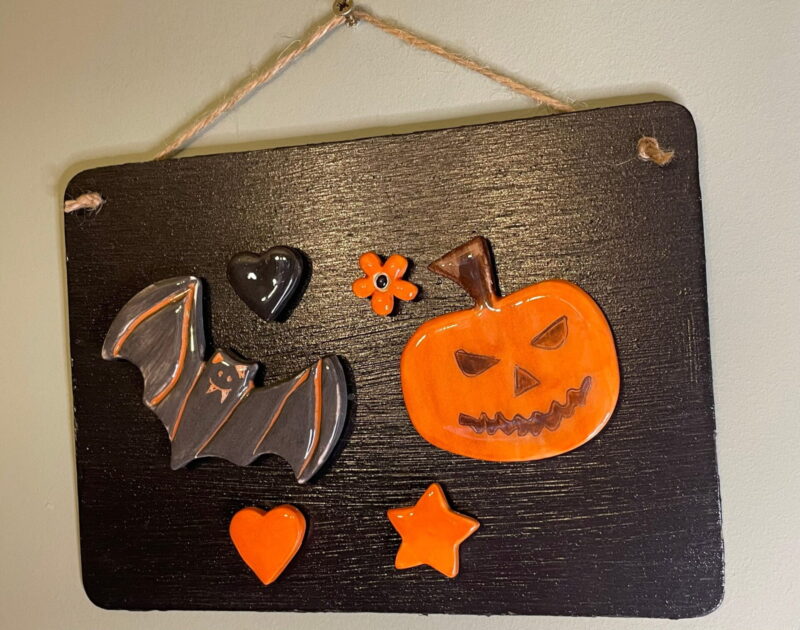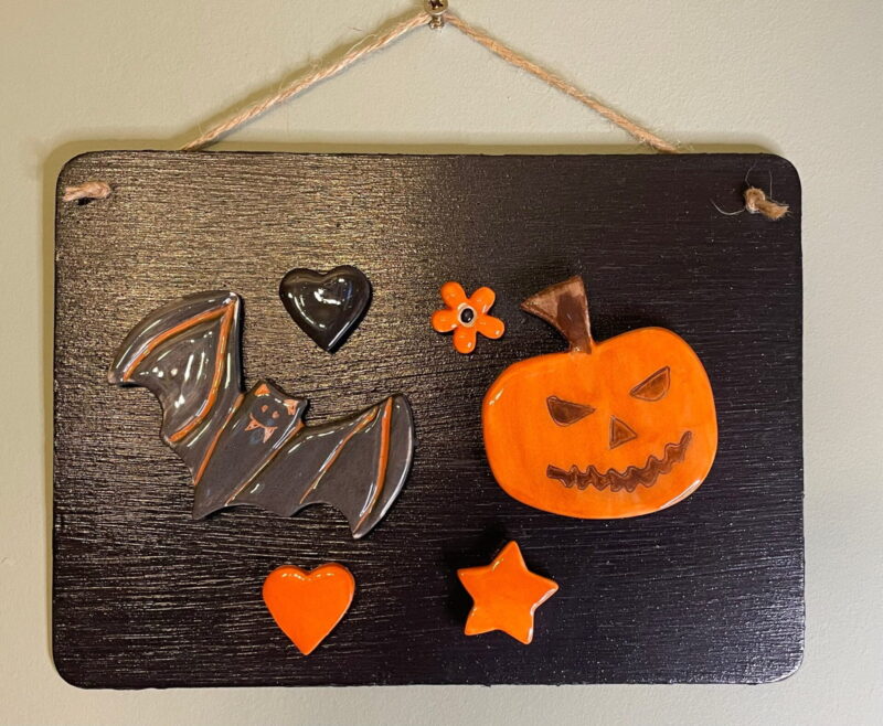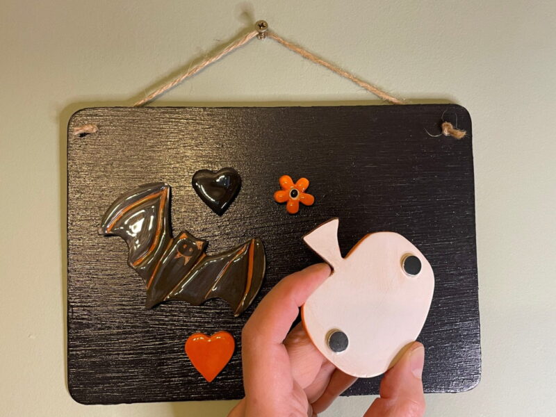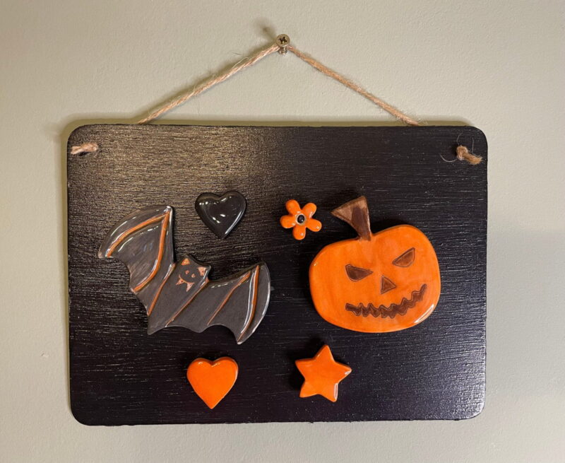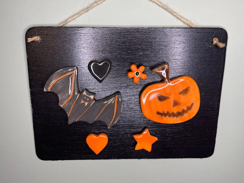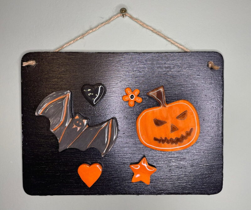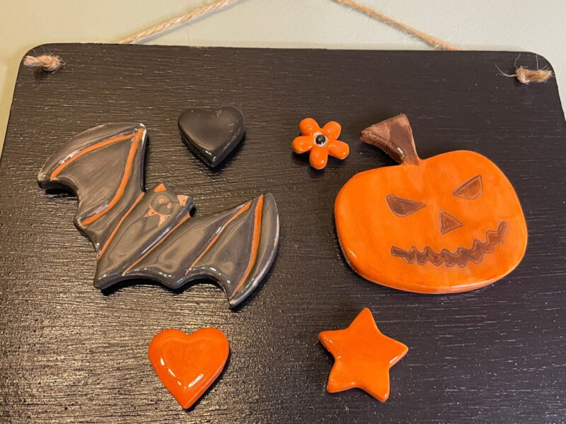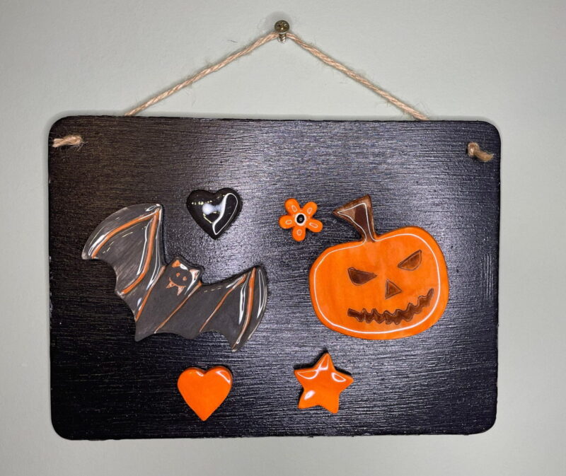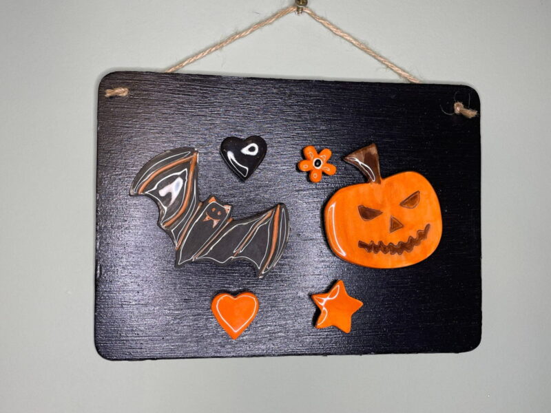 This is a set of 6 Halloween ceramic magnets, including a pumpkin, a Halloween bat, an orange flower, an orange star and an orange and a black love heart. The set can be accompanied by the magnetic board, and used as a lovely autumn decoration. The board is a metal sheet, painted black and varnished with a durable lacquer. Magnets are made from white earthenware clay. They are painted with underglaze paint and then glazed over with transparent glaze. These pieces are great on a notice board, on the fridge or as a decoration on any metal surface that can be magnetised. Can be used as magnetic mosaic.