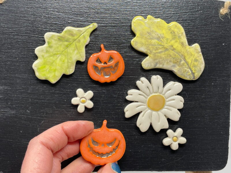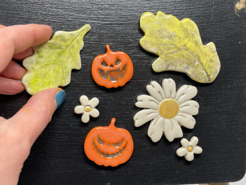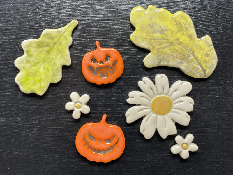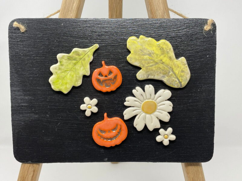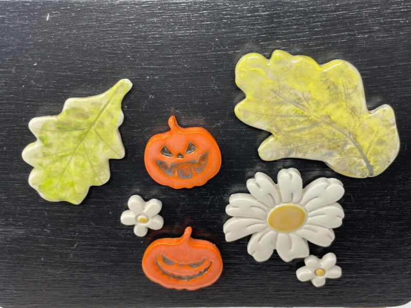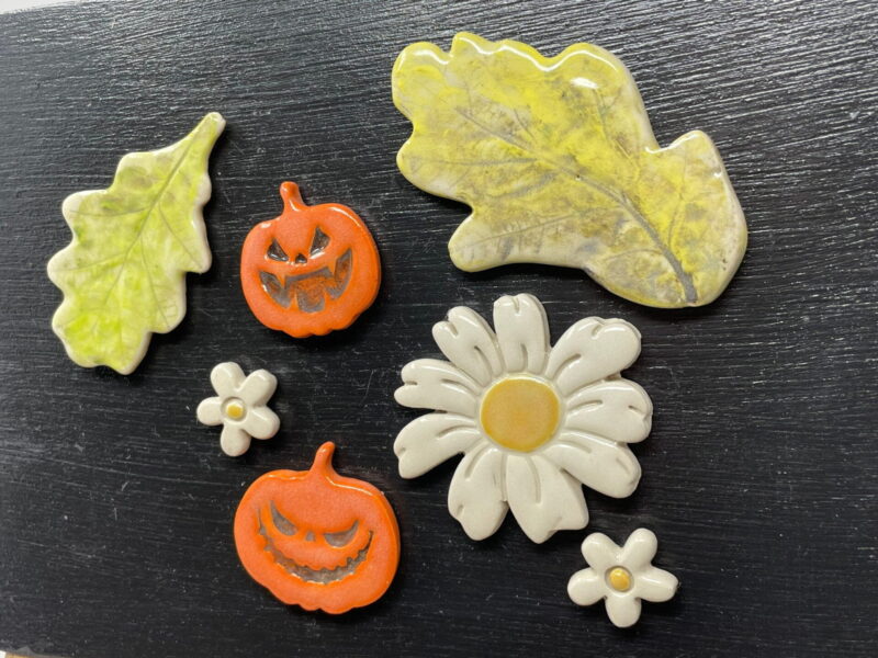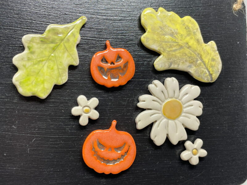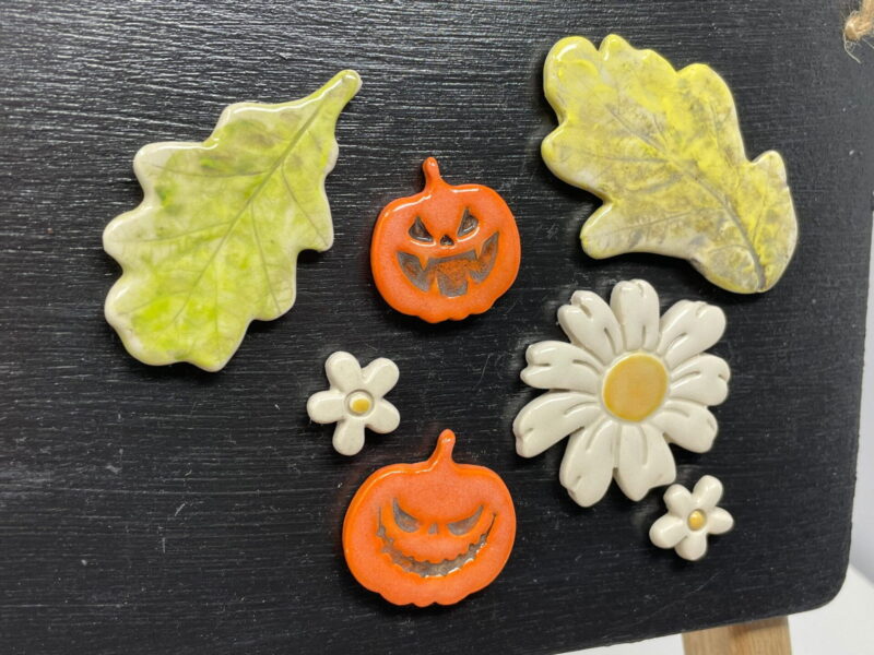 The set includes seven distinct designs – two whimsical pumpkins, ethereal white flowers, and fallen autumn leaves that capture the essence of Halloween while offering a nod to nature. Perfectly complemented by a black magnetic board painted and lacquered for durability, these handmade pottery pieces make an enchanting decoration for any metal surface that can be magnetised.