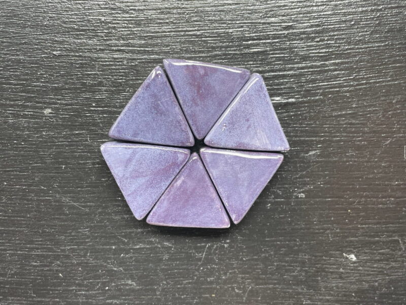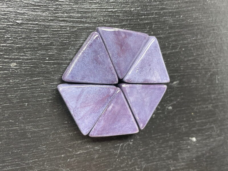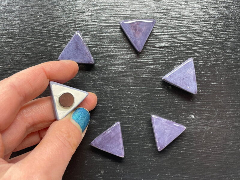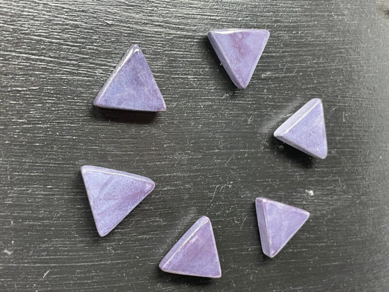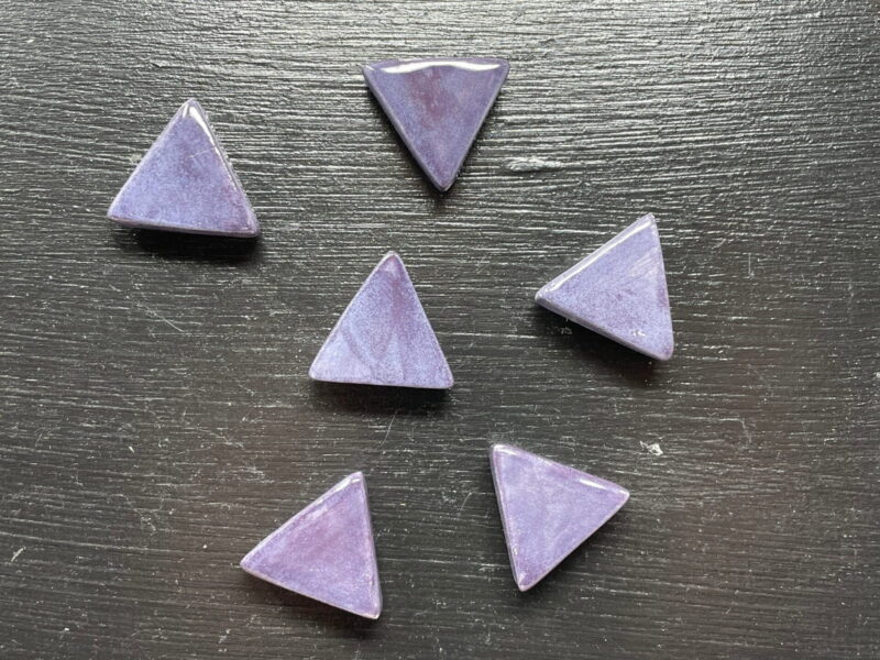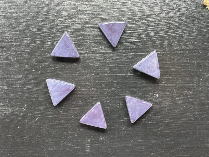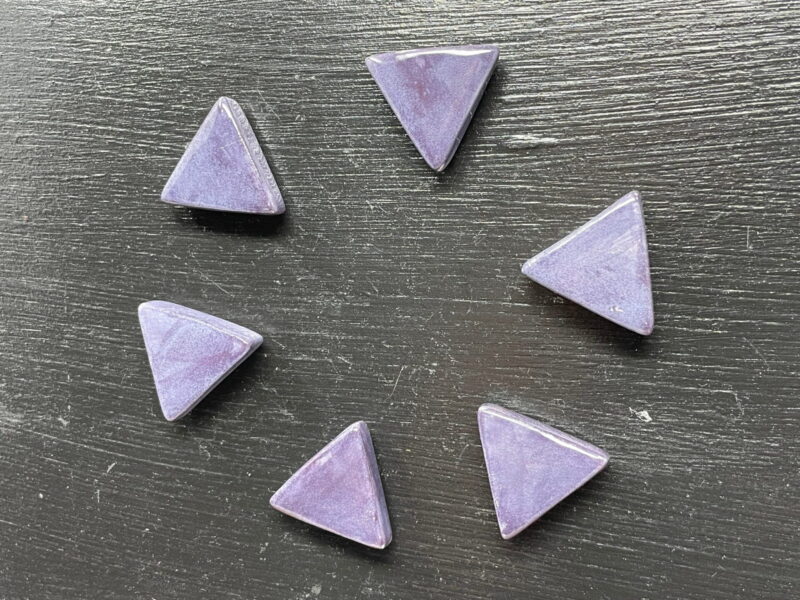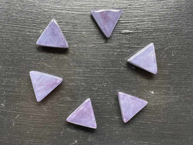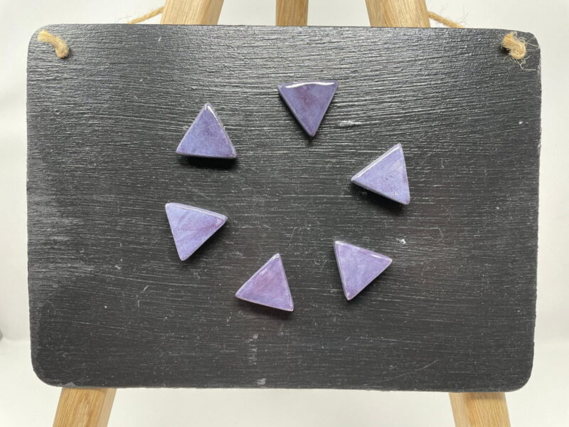 Introducing the Small Purple Ceramic Triangle Magnets Set! A fusion of artistry and functionality, these handmade fridge accessories are perfect for adding a pop of colour to your metal surfaces. Crafted from white clay, each piece is painted with underglaze in varying shades of purple, boasting a mosaic-like effect that's reminiscent of Halloween. The transparent glaze finish not only adds a glossy sheen but also ensures longevity. These purple triangle magnets are versatile – they're splendid on a notice board, the fridge, or any magnetisable metal surface. This set of six ensures you have enough to scatter around your home or office. The small size keeps them subtle yet impactful. Make every day feel like Halloween with these ceramic triangle-shaped fridge magnets!
