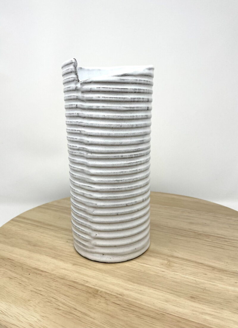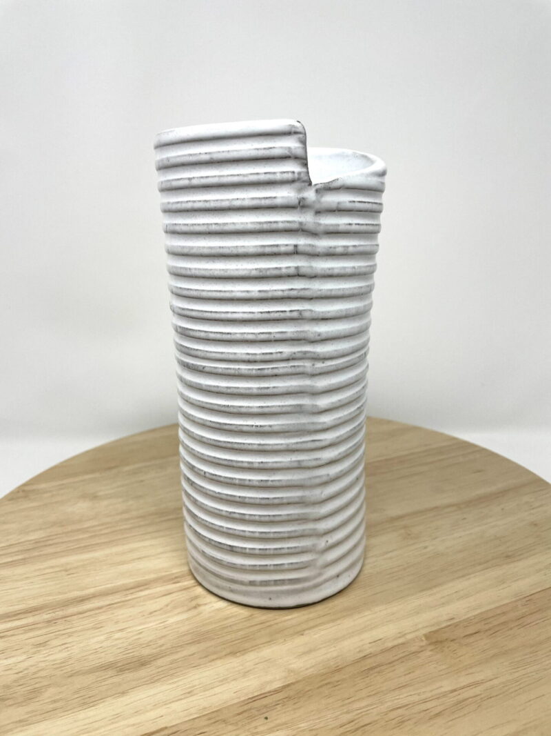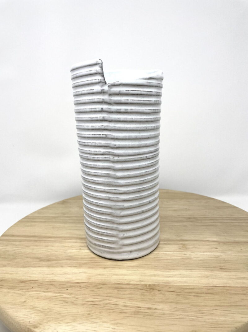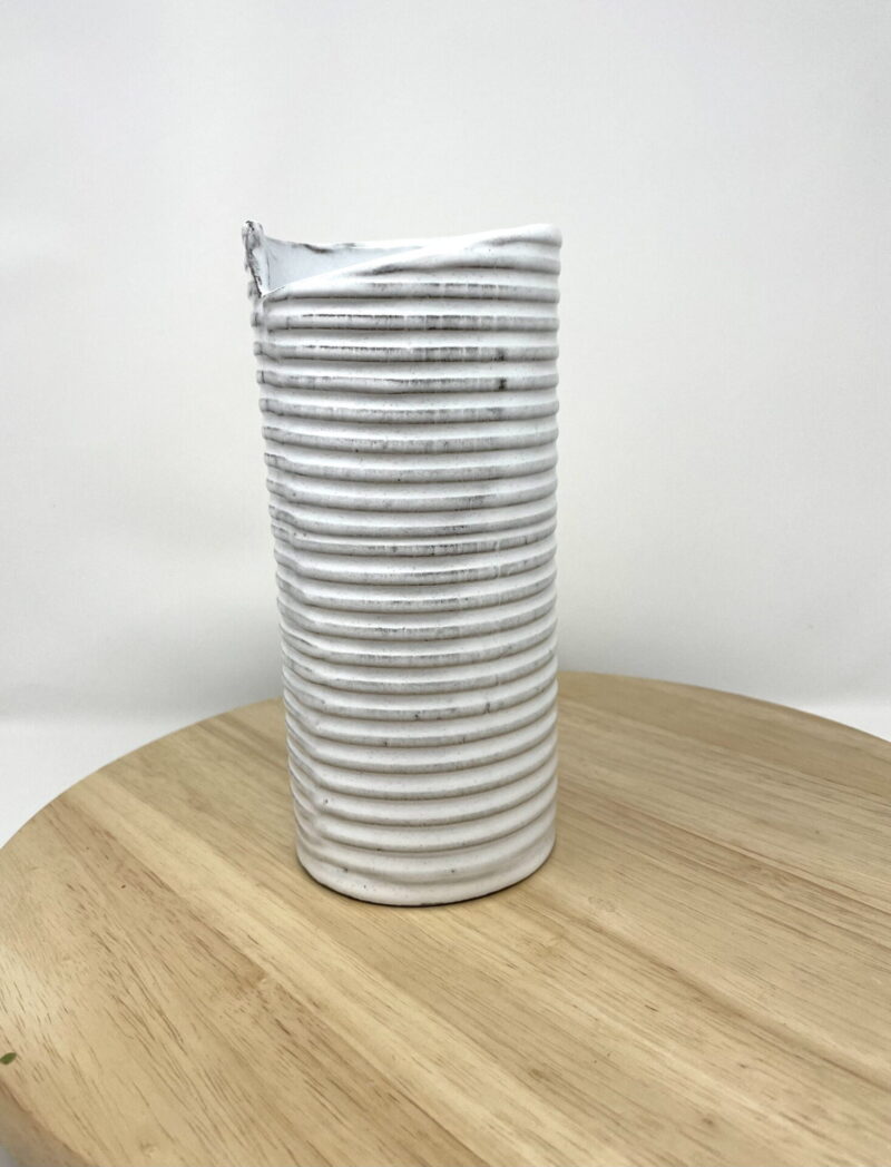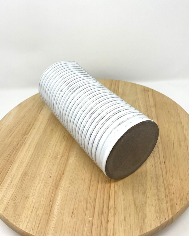 This is a white ceramic vase, hand built by me from grey clay, glazed with white glaze. The vase has beautifully imperfect shape, and the top bit is not level. It was hand-built and not thrown on a wheel. It is textured with horizontal stripes.