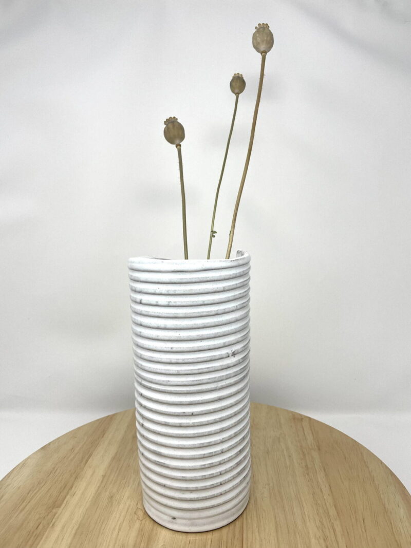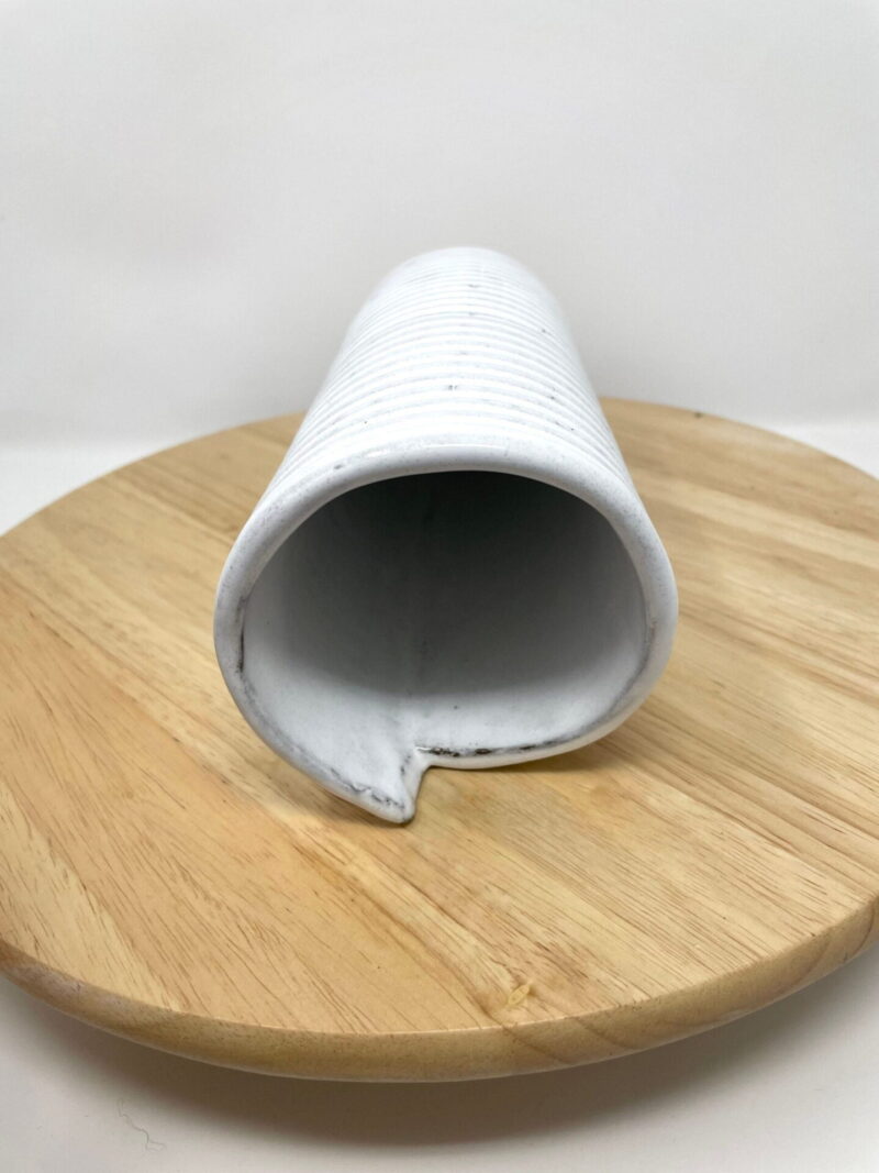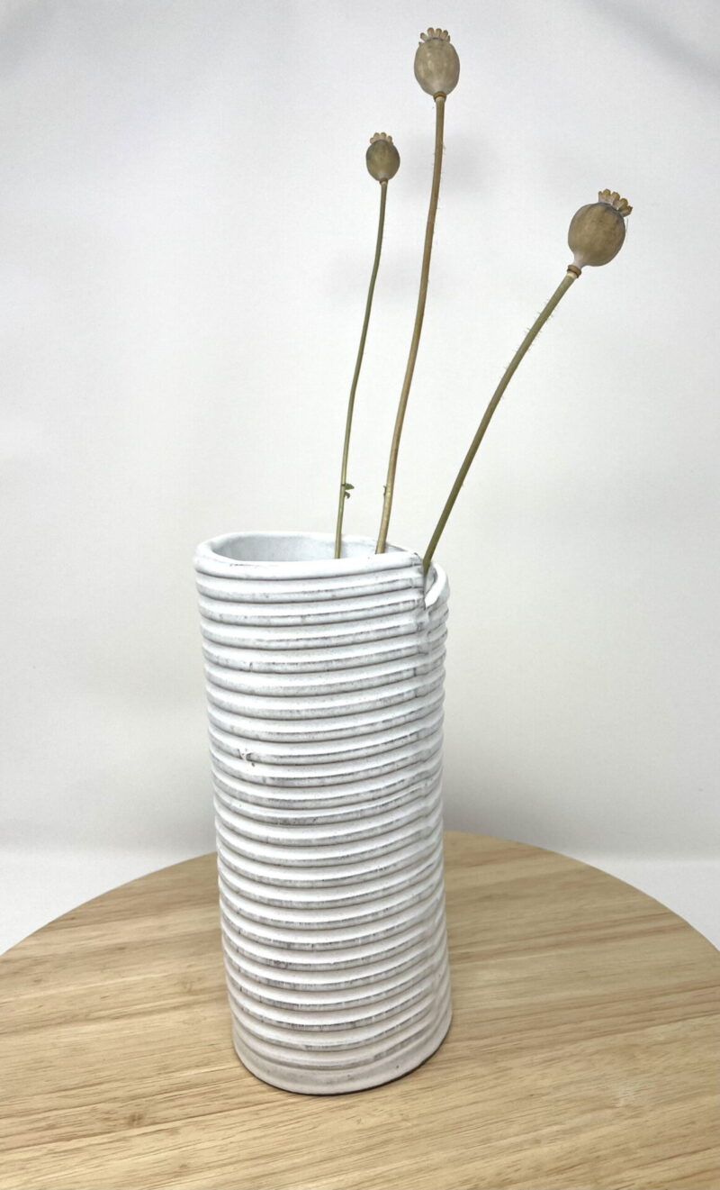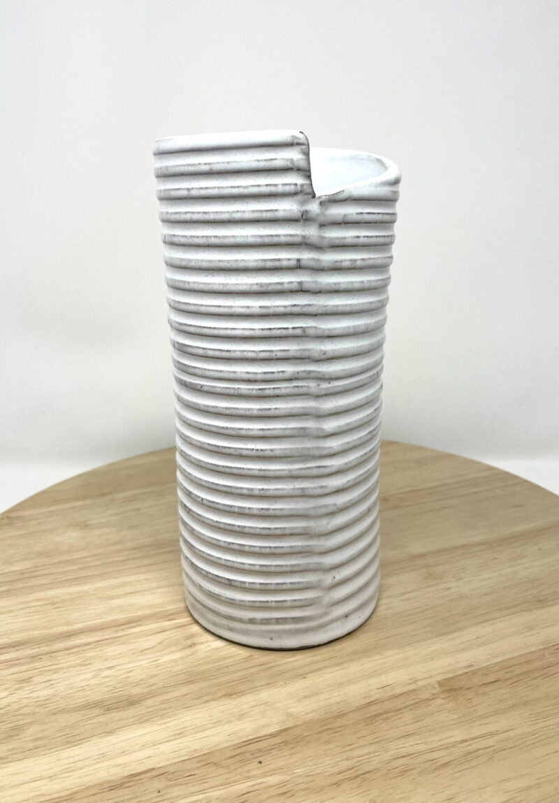 This is a white ceramic vase, hand built by me from grey clay, glazed with white glaze. The vase has beautifully imperfect shape, and the top bit is not level. It was hand-built and not thrown on a wheel. It is textured with horizontal stripes.