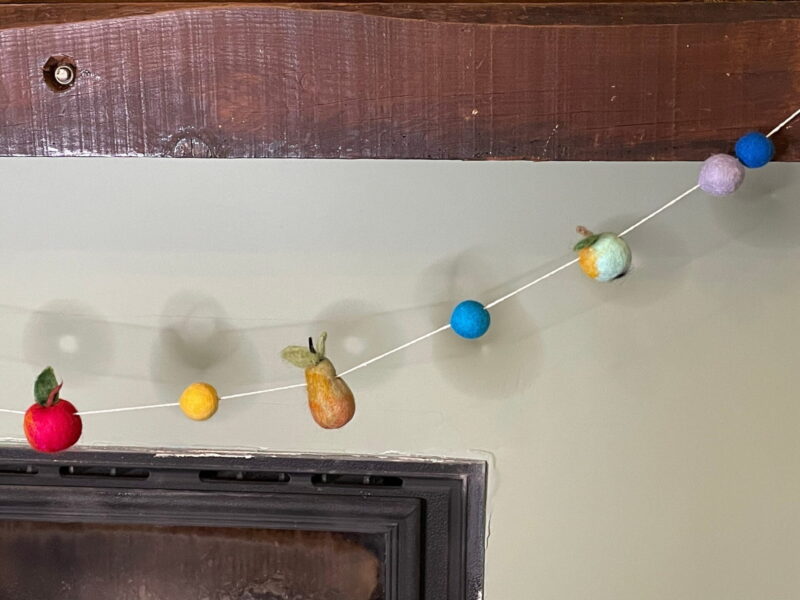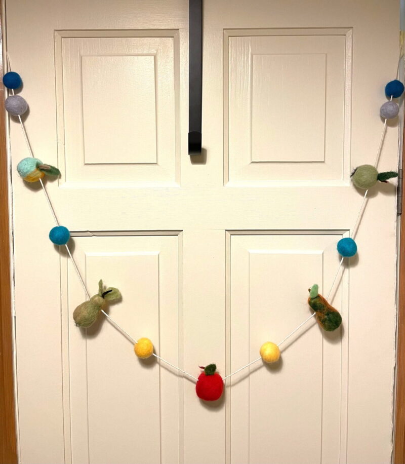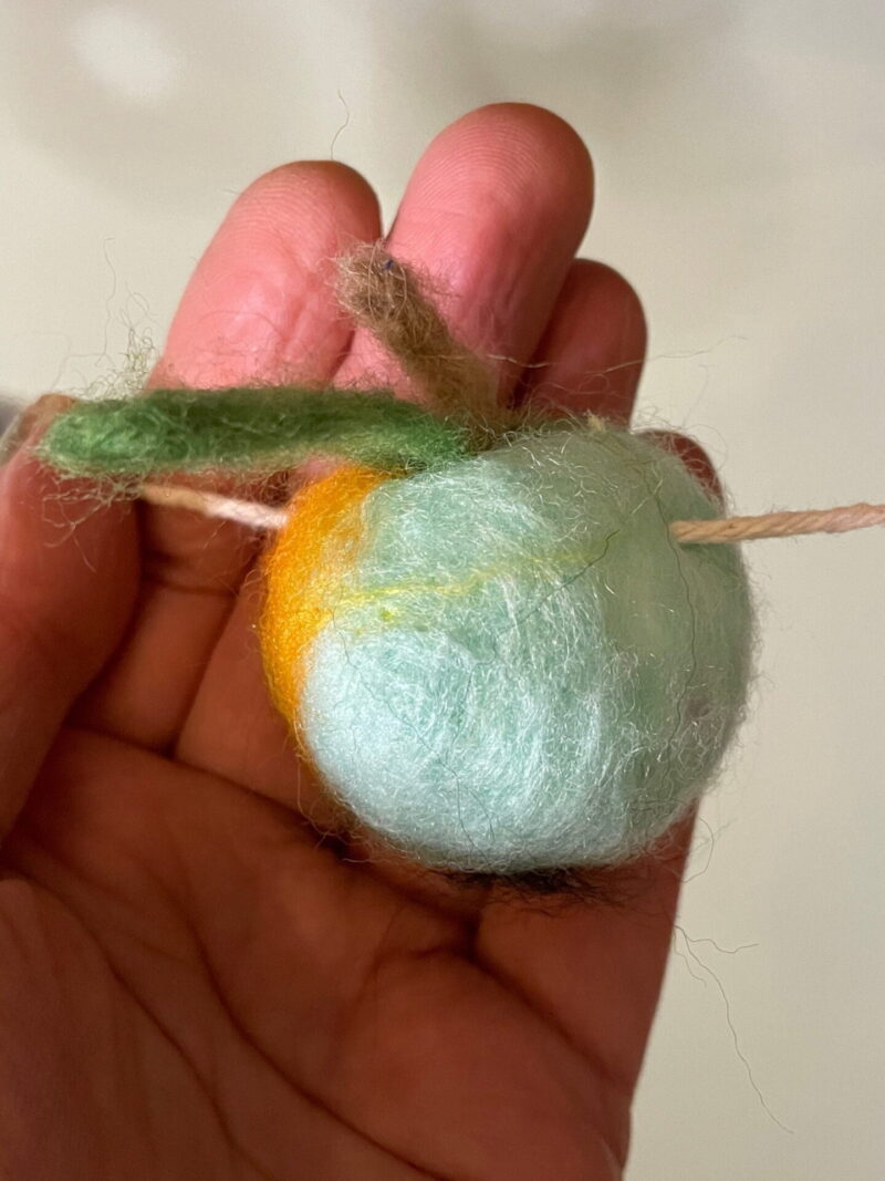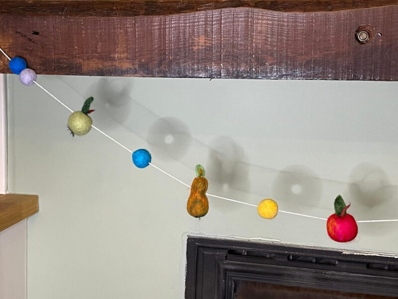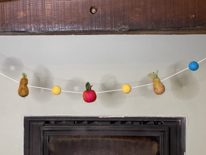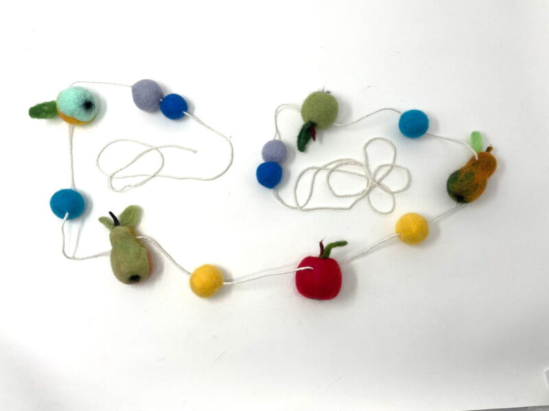 The pieces are all felted onto polystyrene, and strung on a cotton thread. The unique design allows for easy movement of the fruits and balls on the thread so you can adjust the length to fit any space.