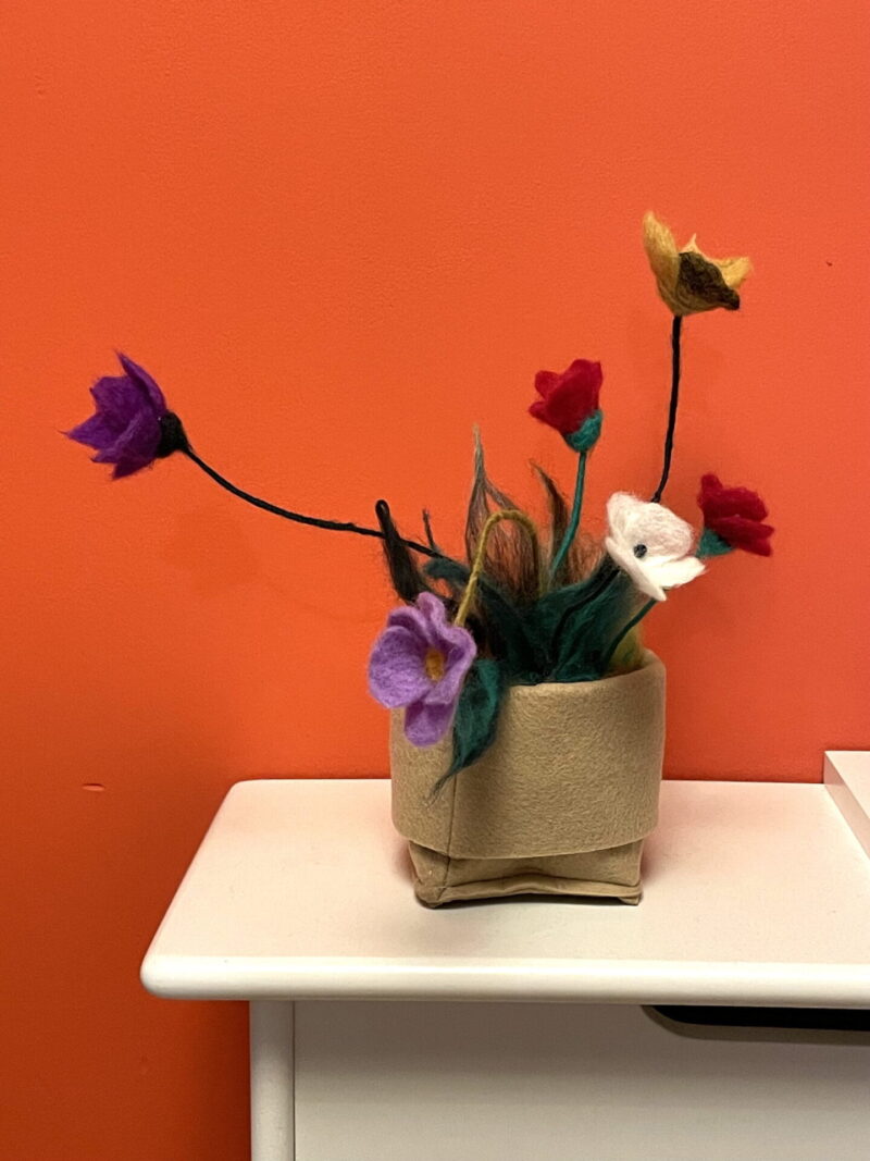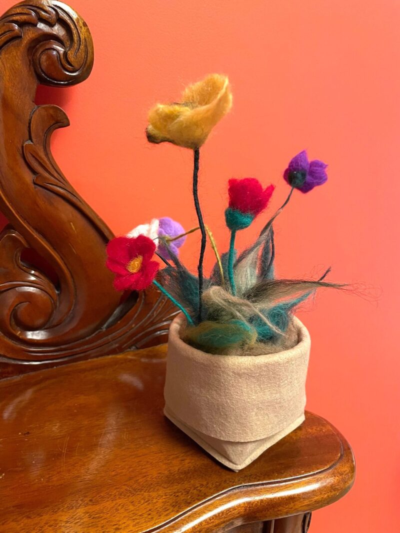 Bring a piece of the meadow into your home with our handmade Wool felted meadow flower in a pot! This beautiful and colorful bunch of flowers comes in a fabric pot, making it a perfect addition to any room in your home.