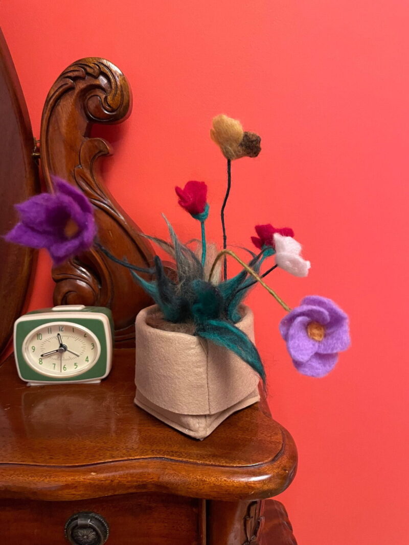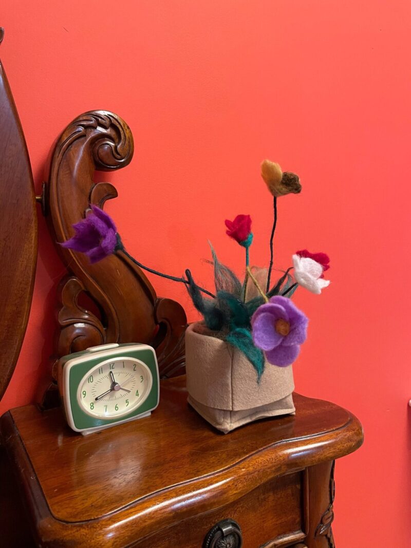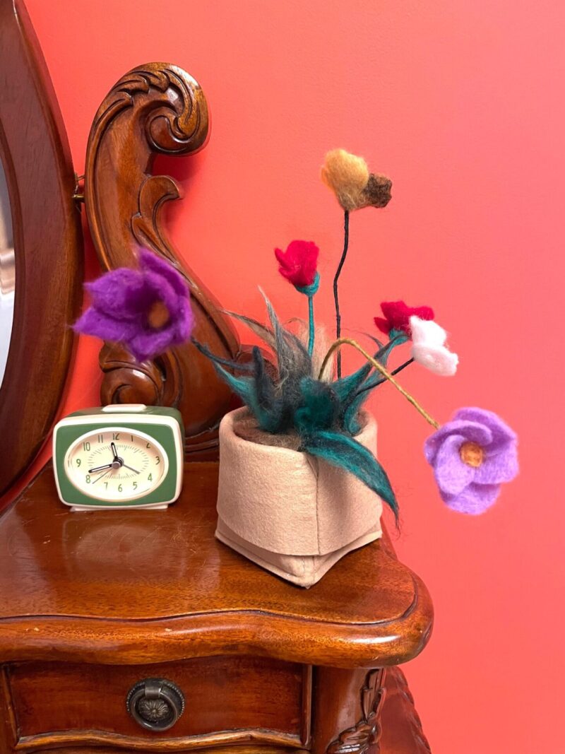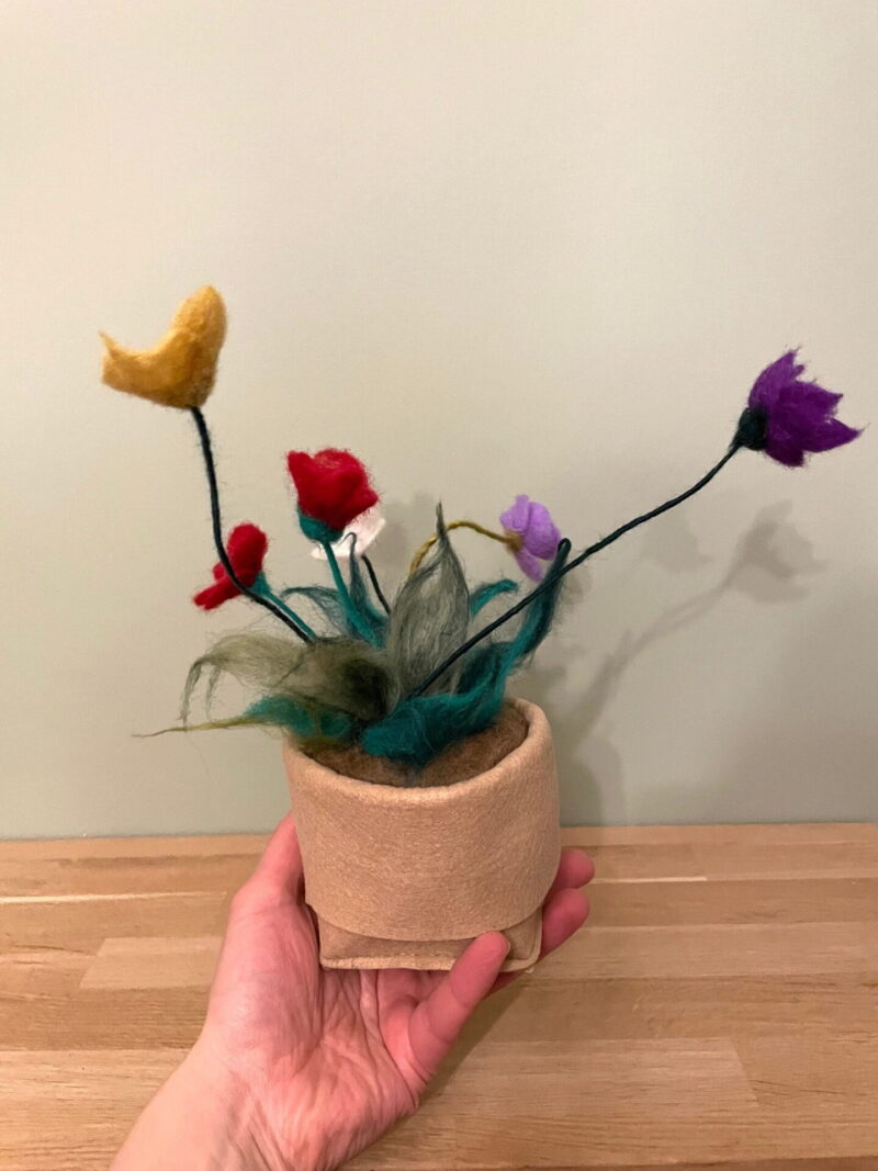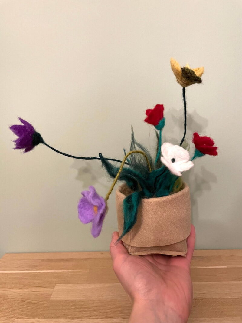 Each flower is individually needle felted from high-quality merino wool, giving them a unique and charming look that is sure to impress. The flowers have delicate metal wire stems, which add to the natural movement of the flowers, creating a beautiful and whimsical effect that looks like they're dancing in the wind.