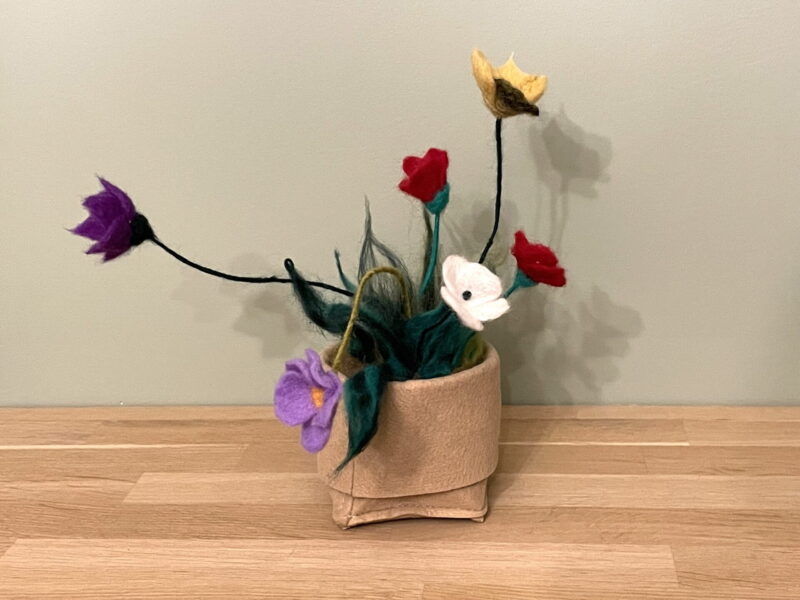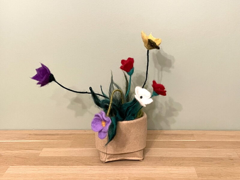 The metal wire stems are wrapped in wool, and you can easily change the position of the flowers to create a custom look. The Wool felted meadow flower in a pot is approximately 25 cm tall, making it a perfect addition to your window sill, beauty table, or ornament shelf.